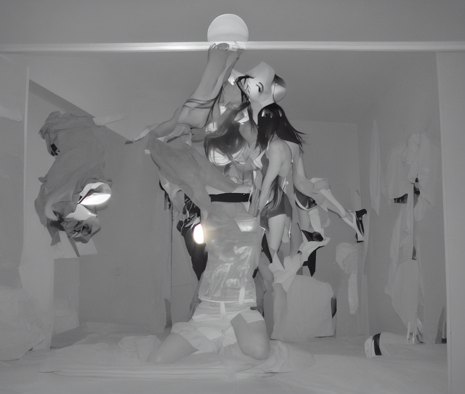 Img2Img is really fun to experiment with, both in Midjourney, and Stable Diffusion. I enjoy the mixing of multiple images in Midjourney, but I also enjoy the stylistic output of the text prompts in Stable Diffusion. With this series, I used a photograph I took during the Summer at an AirBnB in Lake Tahoe. With the photo I was attempting to capture a liminal space, however the images generated using Stable Diffusion created lots of chaos. I'm unsure why so many subjects were generated in the image, but I love the sense of crowding and movement from the "motion blur" prompt. It's also really interesting to see how the AI was turning the image into a new one, as the composition of the original can still be made out in the image generation. Changing the denoising setting was interesting as well, as I tried to keep the setting at a middle ground, so that the room was remained somewhat present in my generations. I also really love the aspect ratio of these images, I feel as though the 1:1 ratio makes the image feel a bit suffocated. Another notable aspect is the composition of the people in these images. I like to think that Stable Diffusion creates images that look and feel like a cut-and-paste collage. I felt that in this series that effect is definitely applied to the subjects.