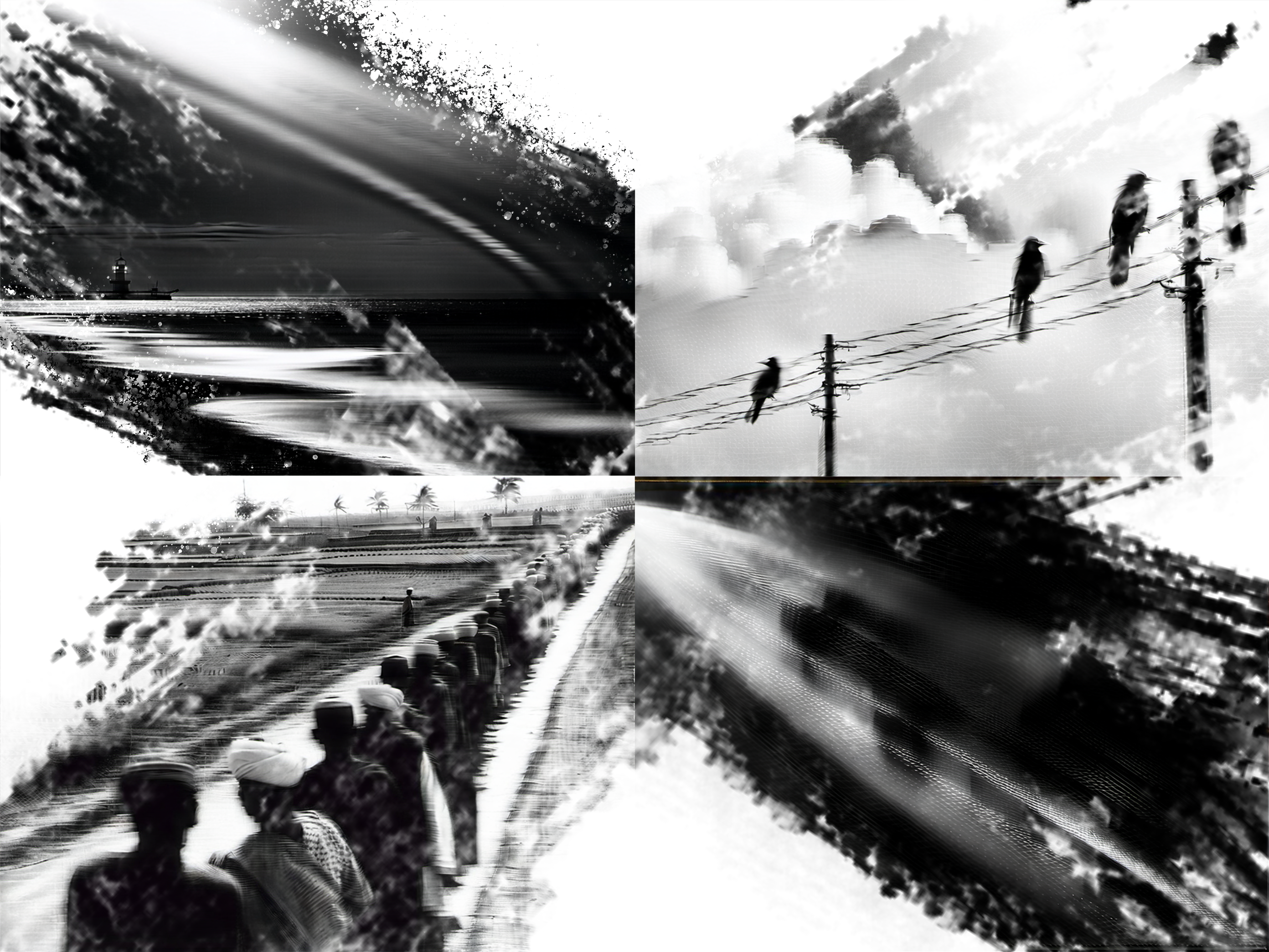 To execute this concept, I utilised the new refiner model on SDXL, generating a series of black and white photographs. The prompts I employed focused on emphasising strong diagonal trajectories within these images, intending to establish a geometric path of coordination for the envisioned collage. Thematically, my contemplation centred around the concepts of isolation and unity within the elements portrayed in the photographs. I aimed to observe how the dialectic relationship between cluster and sparseness engaged in a meaningful conversation, particularly when their common thread was their geometric compositional alignment. The four images I sought to generate included a lonely lighthouse, a comet in space, a group of villagers in India, and a flock of birds on an electrical cable.