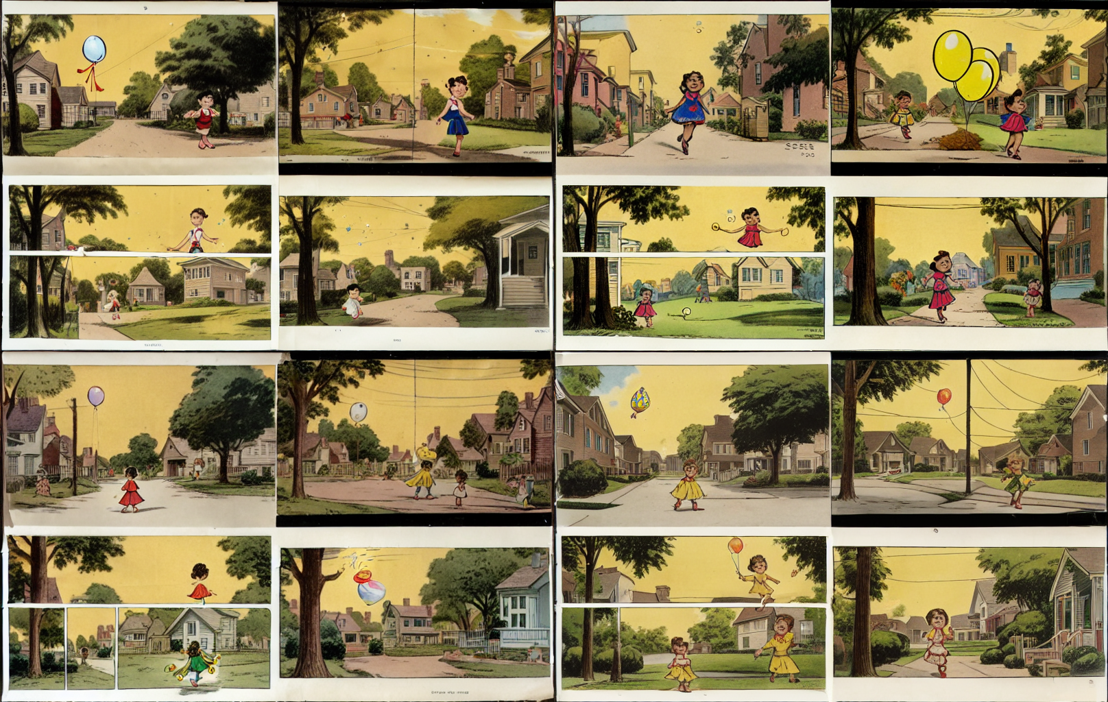 Prompt: An 8-year-old girl walking through a suburban neighborhood with her dog and her balloon floats into outer space. Comic book scene, strip of several related scenes unfolding a story based on 1950s-style hand-drawn illustrations, simple colors, and heavy black outlines. White framing around each scene. Sepia colors. The story unfolds through multiple scenes about a six-year-old girl who has a pet dog and loses a yellow balloon in some trees. Looks like it is within a paper print newsprint. Playful and fun setting in a neighborhood, with simple cartoon human characters. Negative prompt: adults, grey, silhouettes, abstract Steps: 64, Sampler: DPM++ 2M Karras, CFG scale: 16.5, Seed: 3253048867, Size: 808x512, Model hash: 7440042bbd, Model: sd_xl_refiner_1.0, Denoising strength: 0.75, Version: v1.6.0