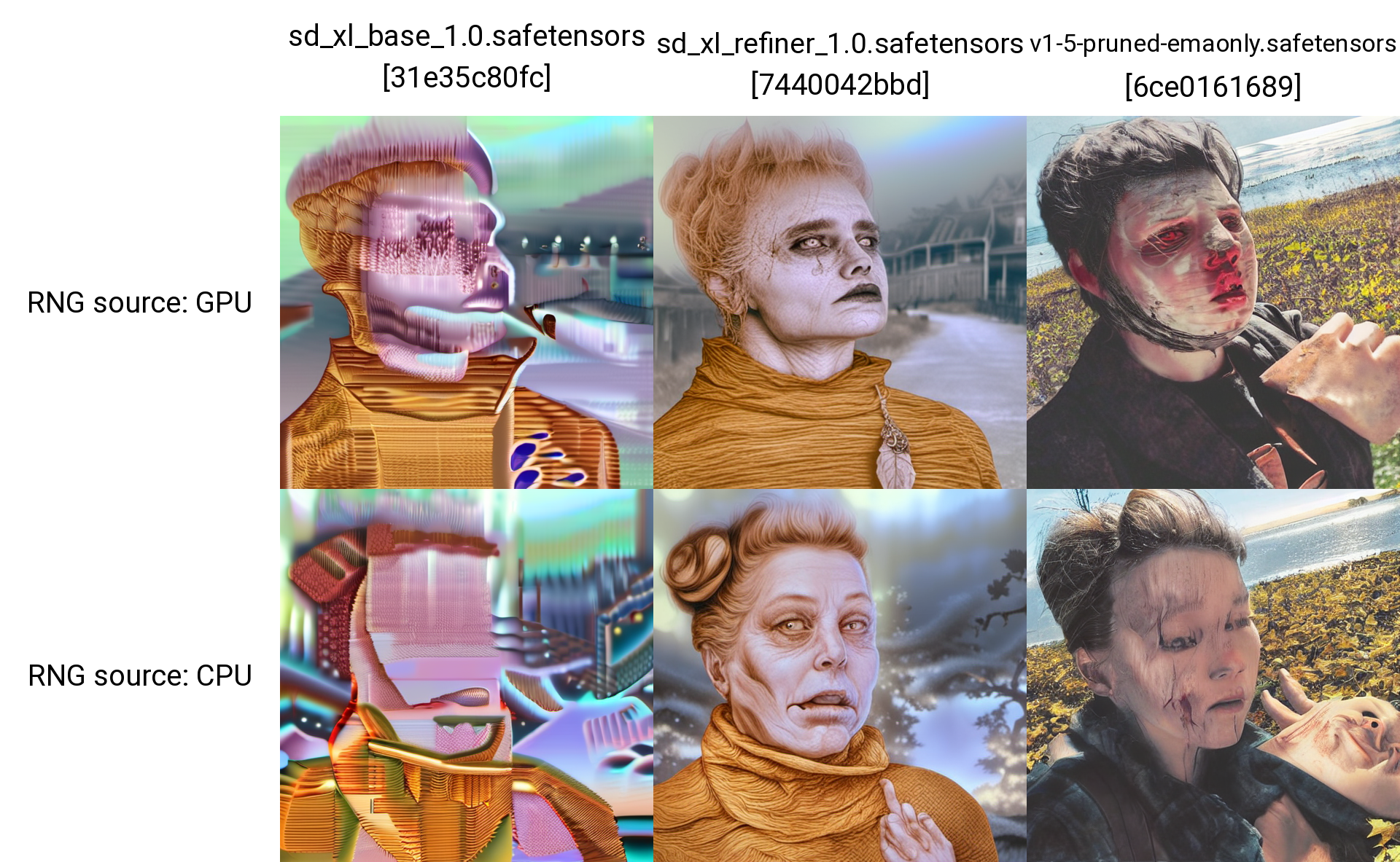 The intent of this study was to explore how the RNG values generated from the XYZ plot through the GPU and CPU affect the image, as well as explore the extent of which negatives can remove features from an image to image prompt, while also experimenting with how CFG scales and Denoising can be changed to affect how much of the original image is changed based on the prompt. Initial tests showed more of attempts to remove features, but later on, the use of a negative prompt was dropped, as it seemed unable to fully remove the undesired traits. Despite this, the results produced afterwards were satisfactory. Some refiner checkpoints appear to be very biased when it came to color schemes, and were even able to create wildly different images, without faces or humans, from the others in each batch, despite there being no indication to remove human faces. It also appears that using NV and GPU as RNG sources is redundant, since they produce identical images, which is likely due to the random numbers they produce are used as seed values. It appears that when it comes to img2img prompts, the CFG scale has less overall influence on changes to the original image, than the denoising scale does. A proper balance is most likely necessary in order to create an entirely new, yet lightly similar image.
