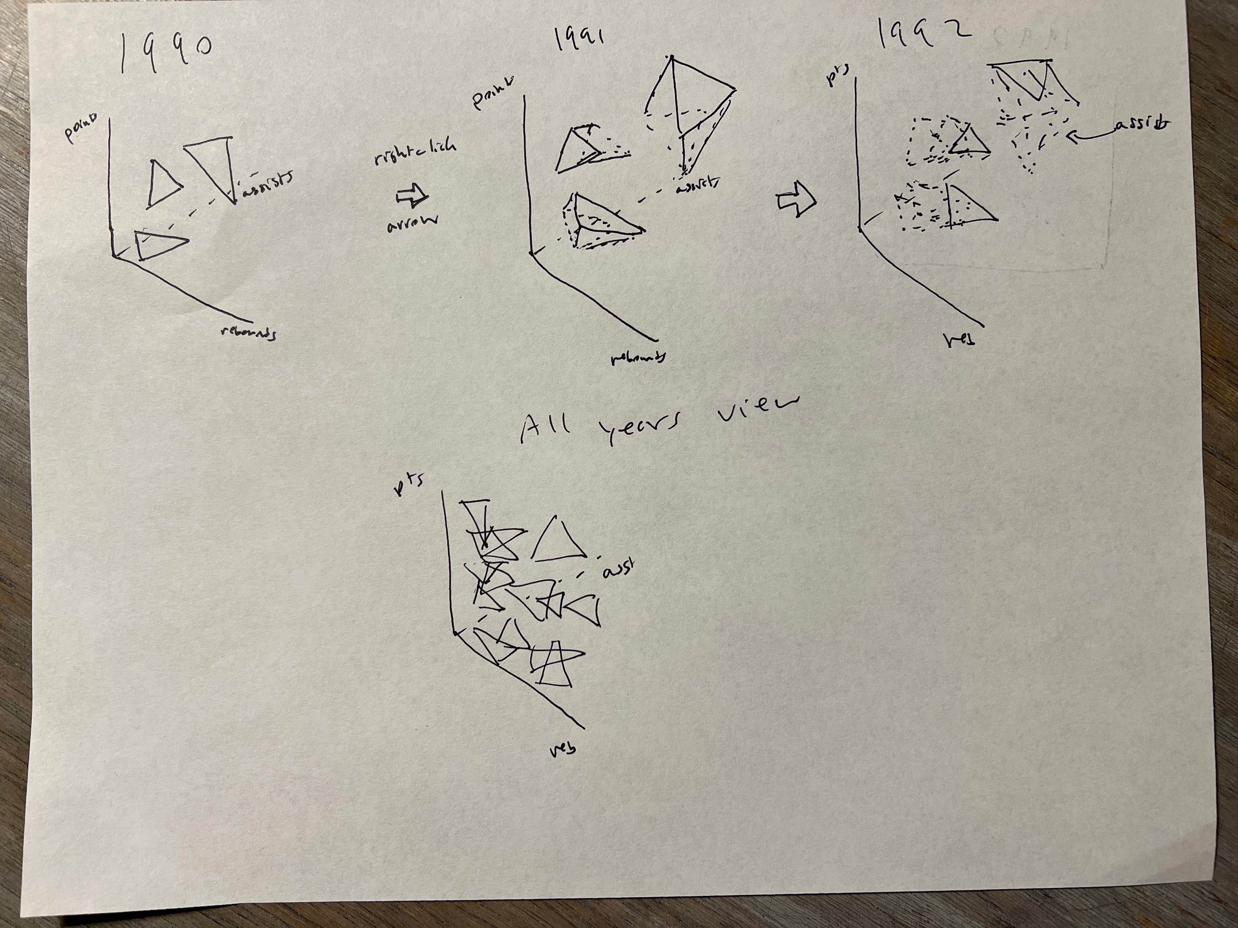 The idea for the visualization so far is to do a 3D plotting of basic stats (points, rebounds, assists, steals, and blocks) per season for every player. The idea in my head as of now is that you can click through each year, viewing historical traces of players that remained in the league the next season. I would also like other buttons that allow you to see all players and all years, players with the max value for each stat, and maybe even a view of all players on a team in any given timeframe. Attached are sketches that show my idea for this visualization. What is yet to be figured out is how I will display my information; I could use Bezier curves, but want the data to be readable, so I might end up combining rebounds+assists and steals+blocks. Or I might just eschew steals and blocks altogether as they are the less important statistics.