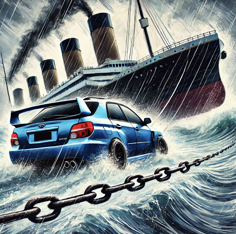 While everything looks almost perfect in this picture, I would specify more about the chain, like "a rusty, thick anchor chain that is straightened with great tension between the WRX and the front of the ship, as well as more details like "a Rally-blue WRX with strong power feeling" and "a wrecked, giant Titanic ship with a strong vide of history".