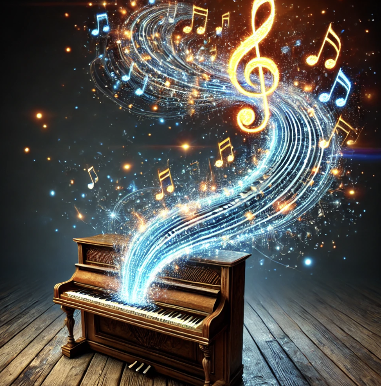 Prompt 3: (Prompt 2 changed from "kinetic art" to "abstract-impressionist art"): "A creative stream of flow bursts out of the top of a classical, old, wooden straight piano, while the flow consists of sparkling, high-tech musical notes glowing bright lights. The entire picture should be in the style of contemporary abstract-impressionist art."