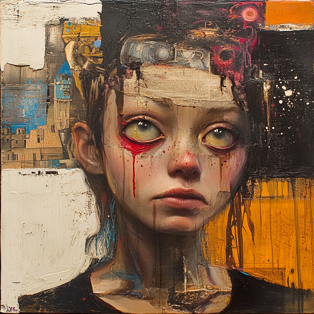 Analysis: the visual style changed dramatically into collage style. Skulls and head body elements. Colorful palette.