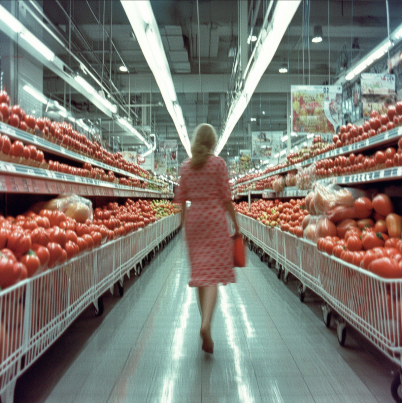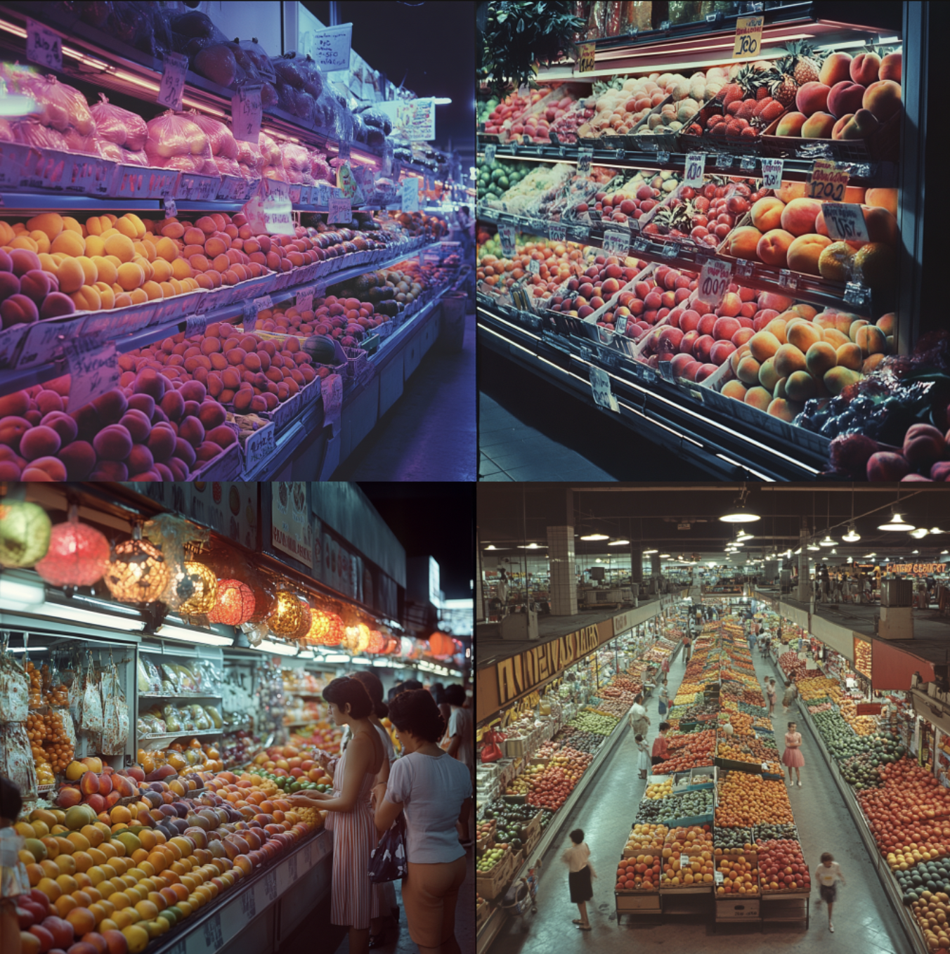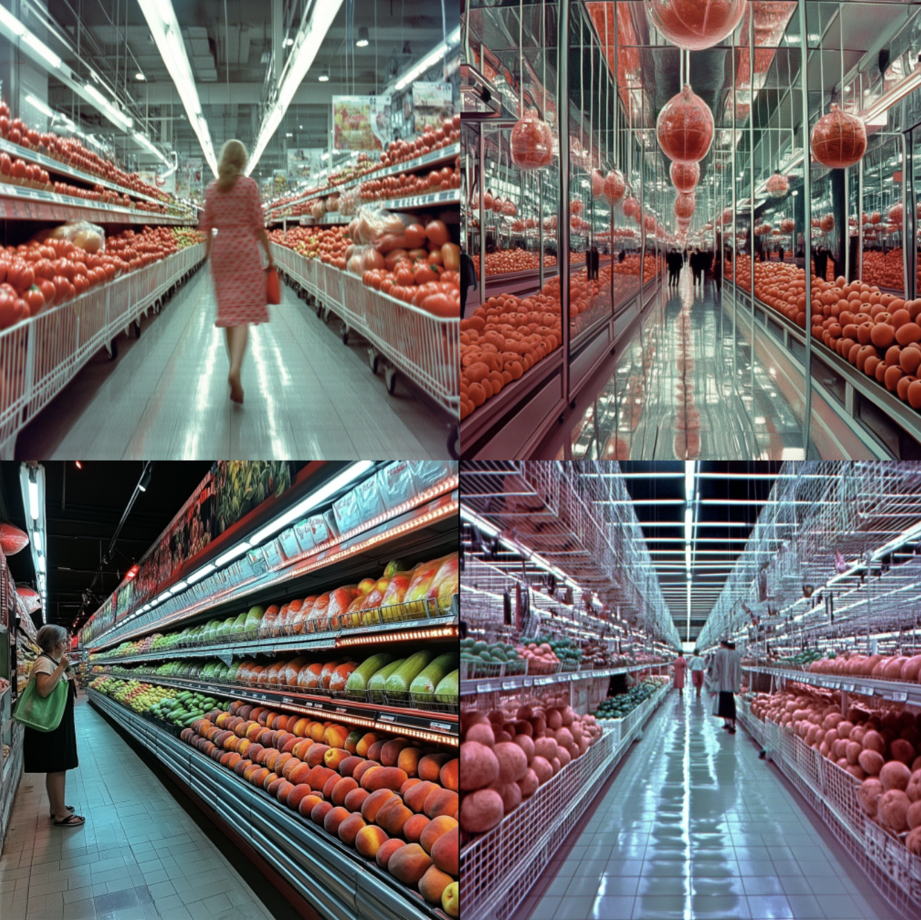 For the next iteration, I set the "weird" factor to 500; I wanted to allow for some of the natural strangeness that Ginsberg's work conjures (however, I wanted to shy away from simply just increasing the weirdness with every iteration. I feel like if I asked Midjourney to continually make the images weirder, and then they got weirder, there really isn't much research or exploration there! So I wanted the surrealness of the poem to come through in other, more indirect ways going forward). I liked these images, particularly the the last one, on an aesthetic level, but still felt they failed to match the tone of the poem: a dreamlike fascination with both the abundance and the commodity fetishism of the "American Supermarket" --weird 500