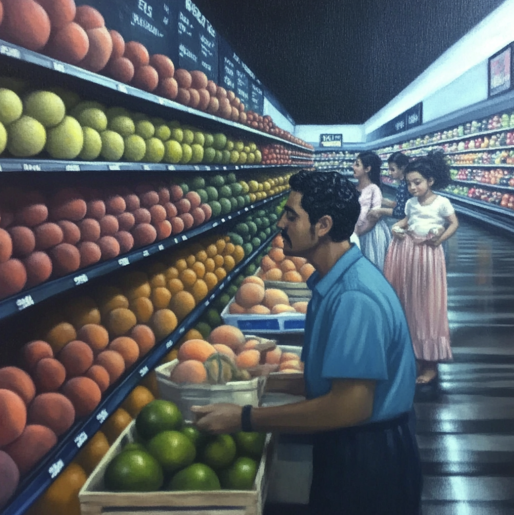a supermarket in california:: In my hungry fatigue, and shopping for images, I went into the neon fruit supermarket, dreaming of your enumerations! What peaches and what penumbras! Whole families shopping at night! Aisles full of husbands! Wives in the avocados, babies in the tomatoes! and you, Garcia Lorca, what were you doing down by the watermelons?:: low resolution:: dutch angle --weird 500 --no products --style raw