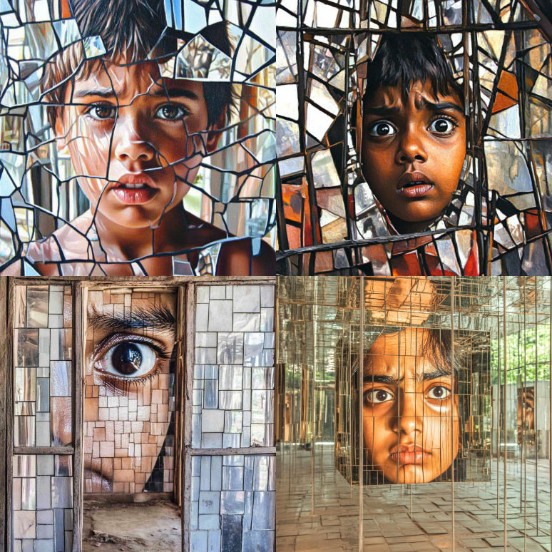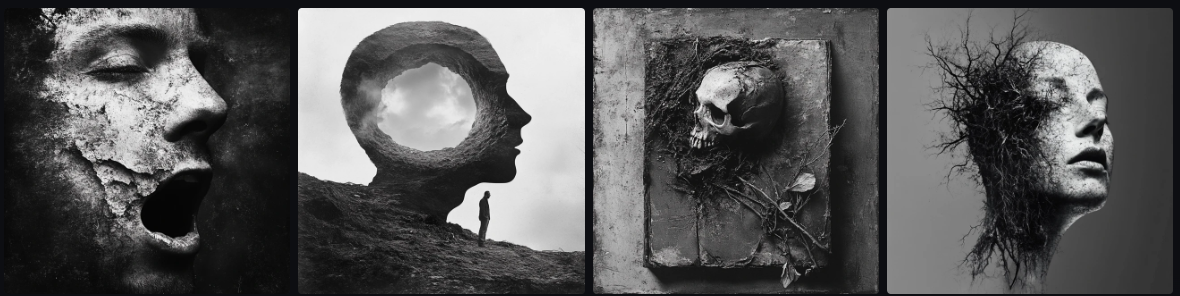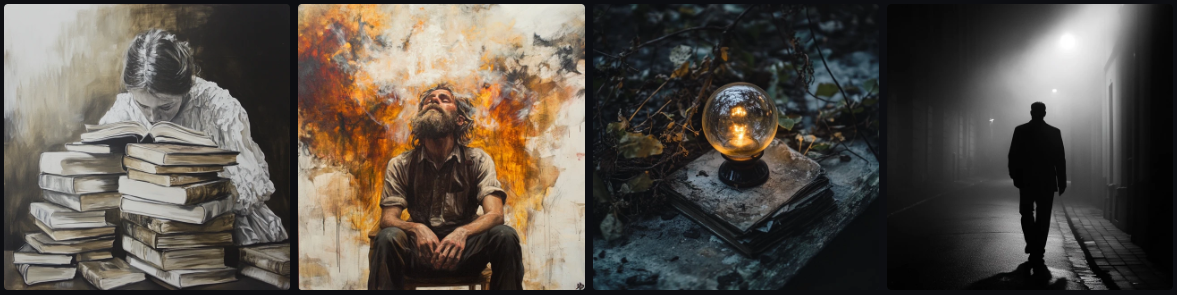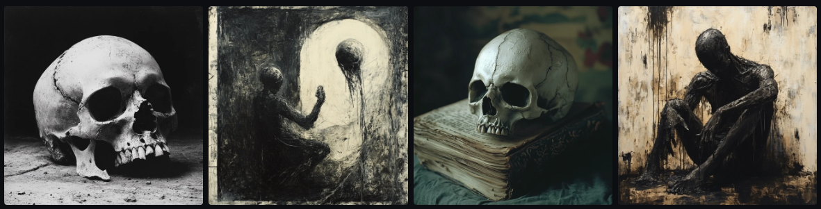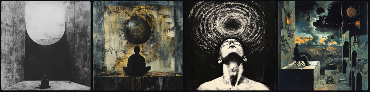 The whole process highlights the tension between control and unpredictability in generative art: while prompts are crafted intentionally and randomly, the AI understands the texts as the reader and recreates the images as the new author, introducing emergent elements that transcend authorial intent. And I am interpreting the resulting images with my own interpretations as the reader.