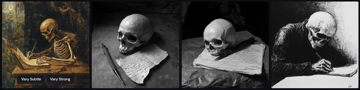 Several times during the prompting process, I got this alert from Midjourney. I'm not totally sure I understand it--why would it create content that it deems against its own community guidelines? And how does it "know" enough to recognize these violations and yet not enough to avoid generating them? And what specific parts of the text I provided led to the creation of an image that was lewd or violent? I don't know! But I found it very interesting.