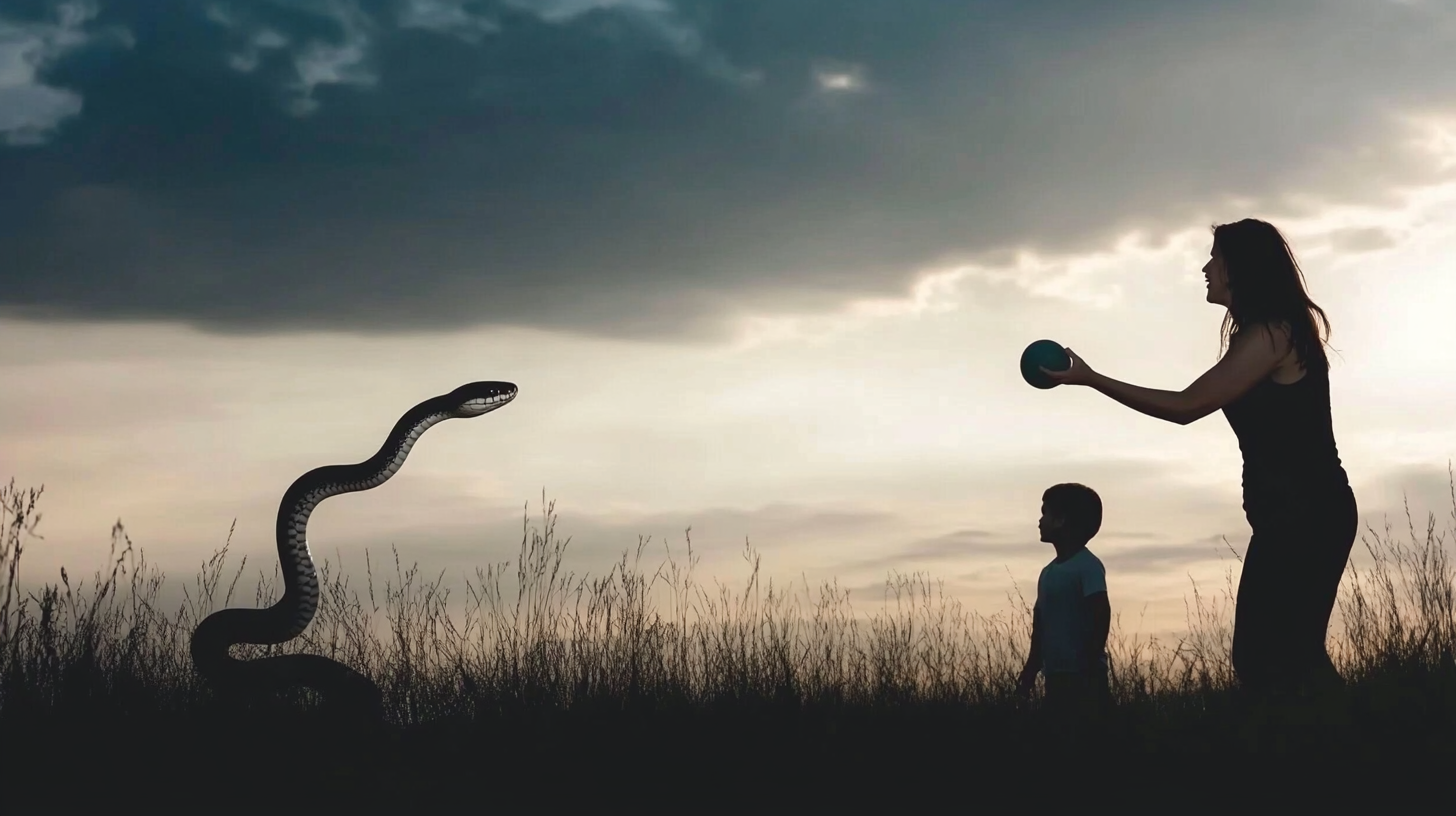 an adult throwing a ball ::1 a child catching a ball ::1 a snake looking at a child catching a ball thrown by an adult ::4 --no jungle --chaos 70 --ar 16:9 --style raw --stylize 200 --weird 2000 --v 6.1
