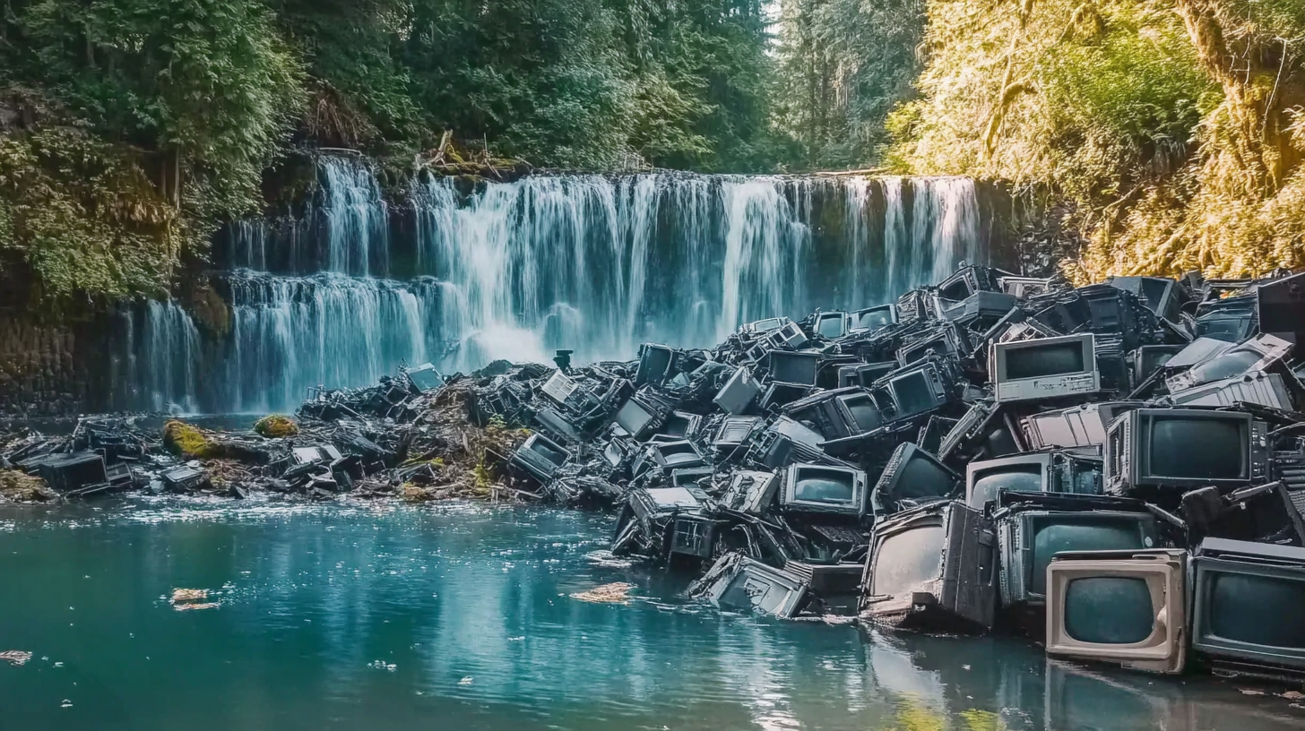 a beautiful waterfall ::1 a huge decaying pile of computers and robots in a pool at the bottom of a beautiful waterfall ::2 --no deviant art --chaos 60 --ar 16:9 --style raw --stylize 0 --weird 2500 --v 6.1