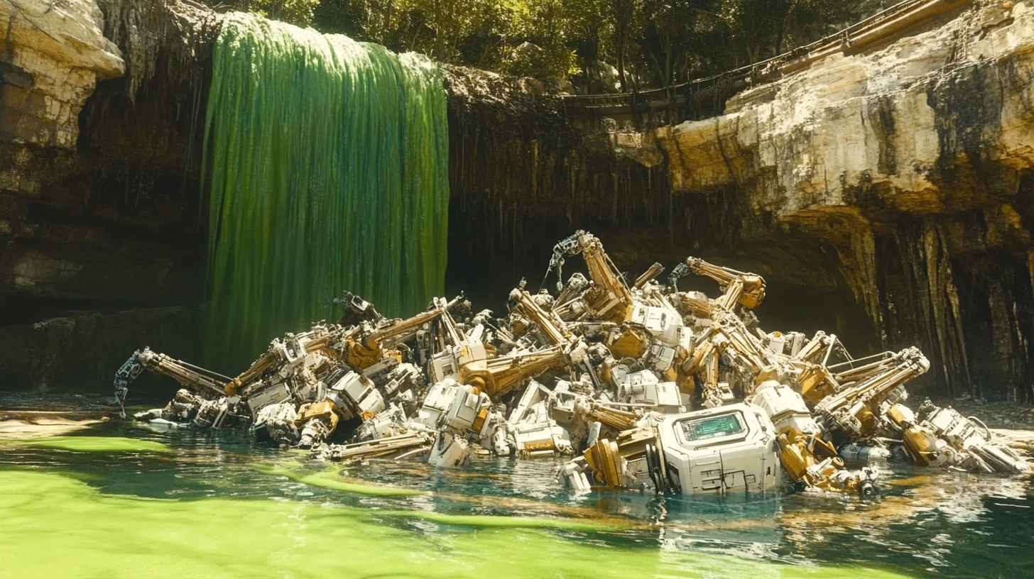 a very huge pile of beautiful computer robots in a pool at the bottom of a decaying waterfall of green slime --no deviant art cars boxes crates water --chaos 70 --ar 16:9 --style raw --stylize 200 --weird 2100 --v 6.1