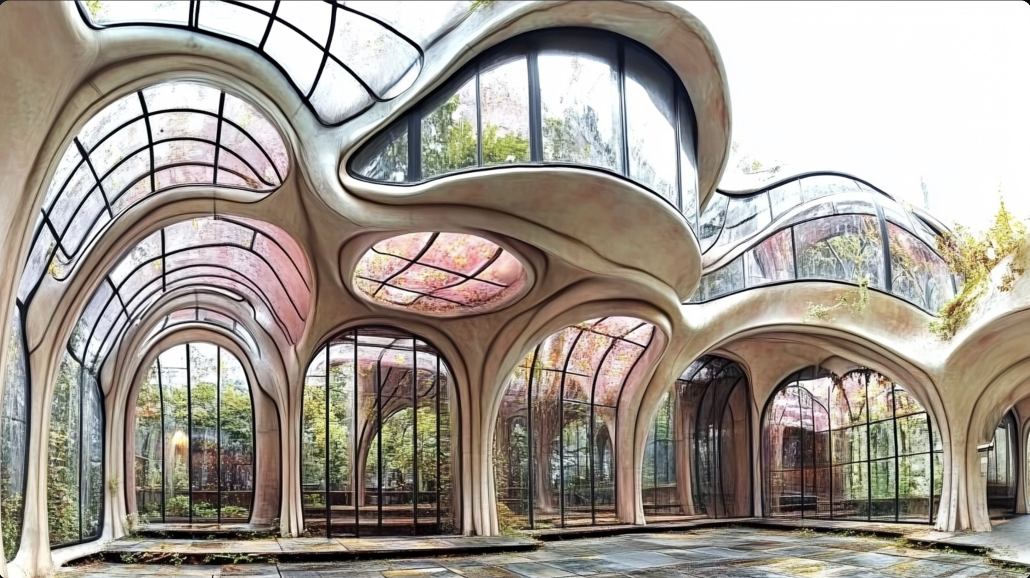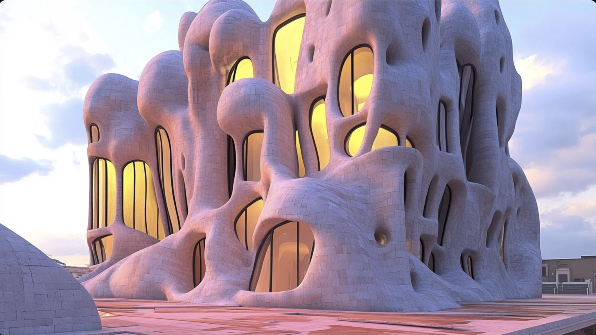 Prompt 2: "imagine Antonio Gaudi inspired architecture, hyperrealism, hyperrealistic, photorealistic, daylight, organic forms"