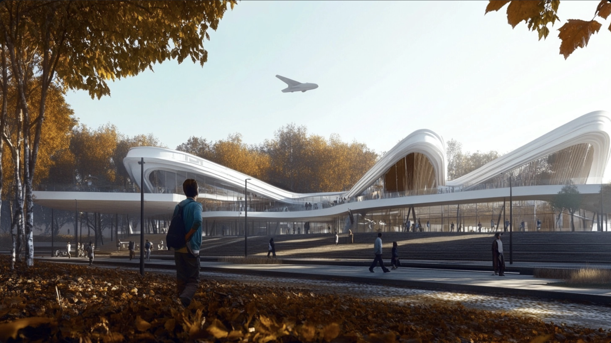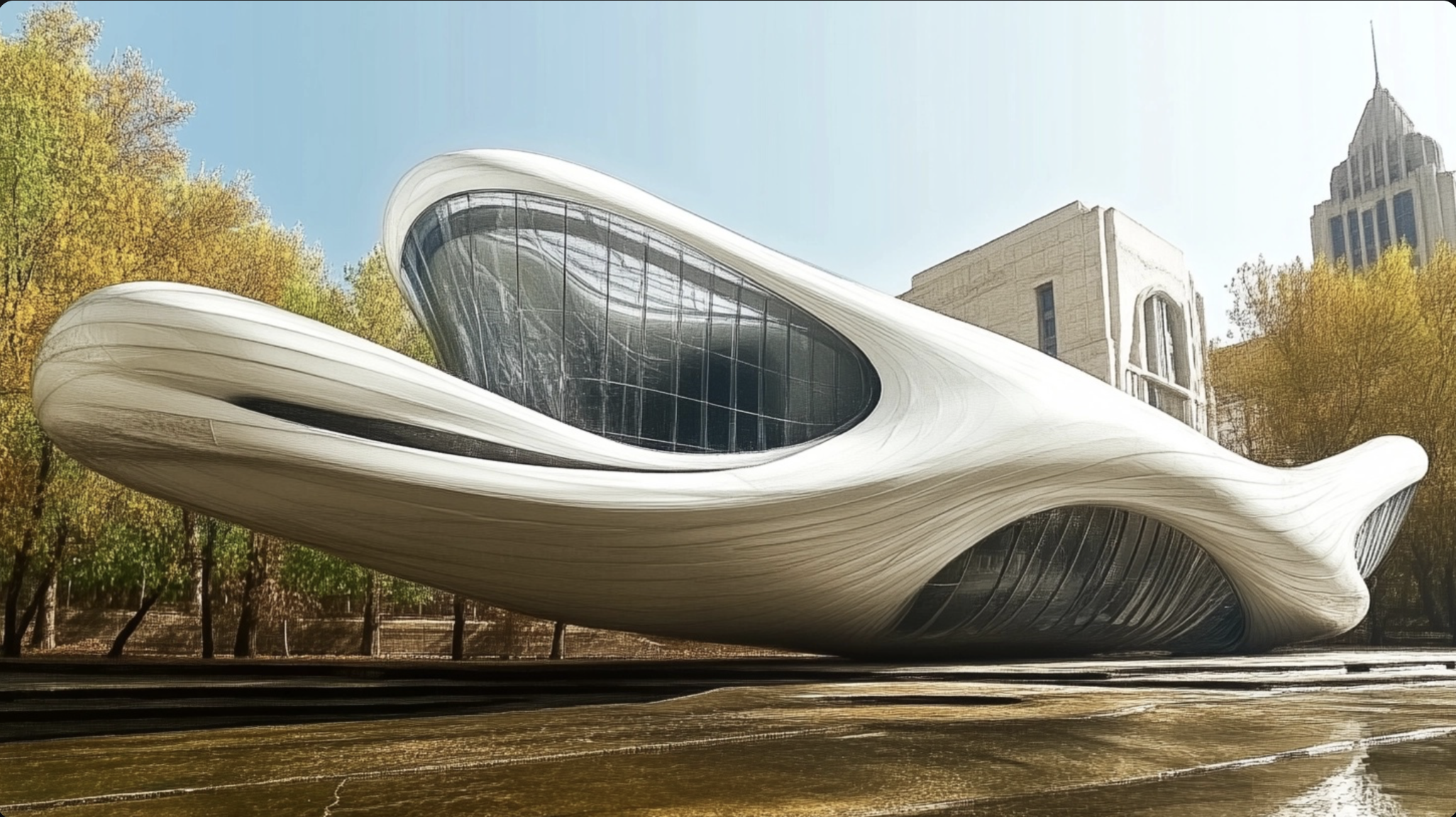 Prompt 4: "Imagine Contemporary architecture inspired by Zaha Hadid, hyperrealism, hyperrealistic, photorealistic, daylight, -- no interior"