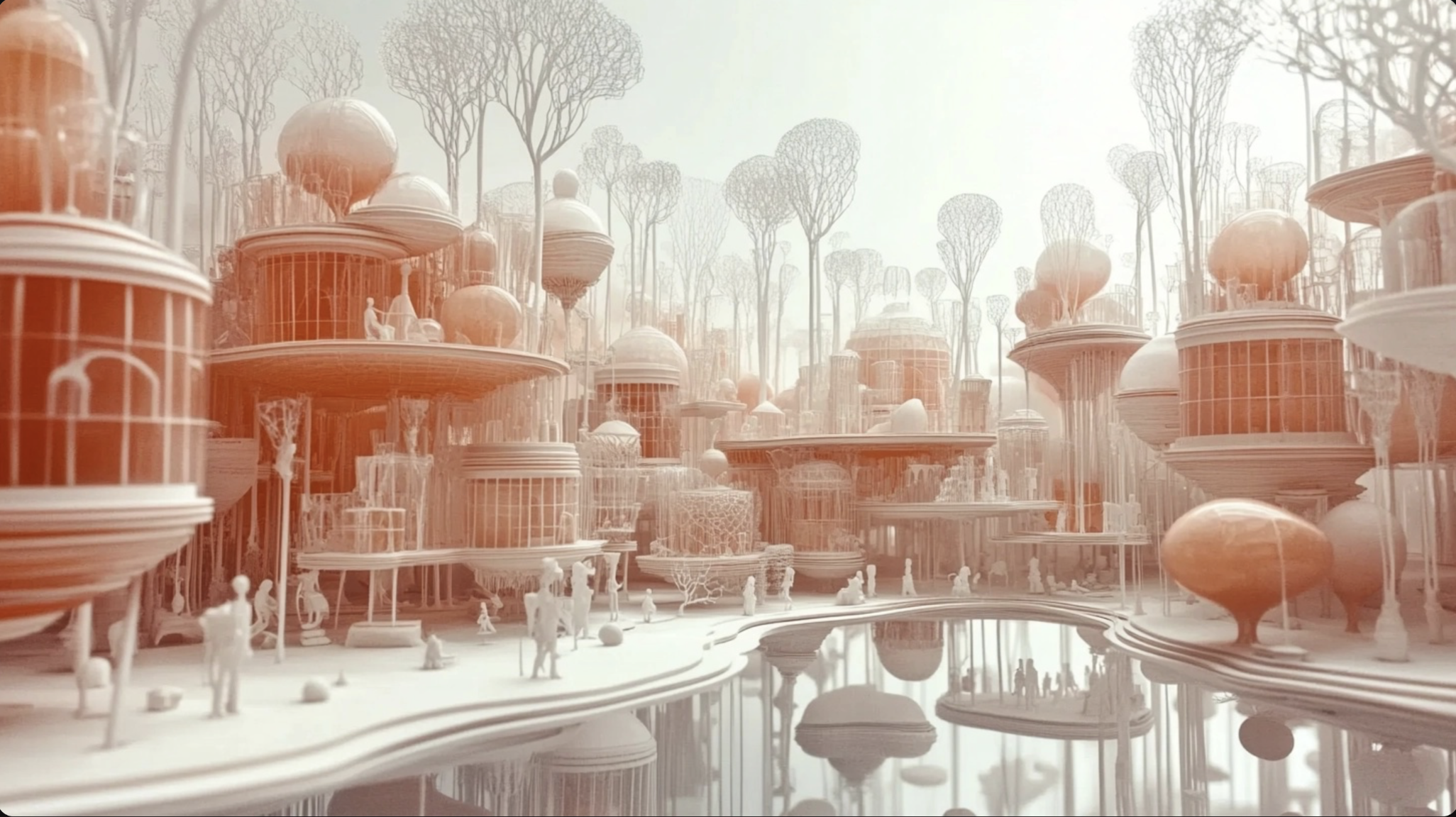 "Buildings made of translucent, pastel-colored, softly glowing under a dreamlike sky, ethereal with flowing organic forms, blending with surrounding, minimalistic urban design"