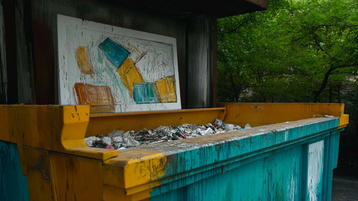 framed paintings compressed, broken, and squashed into cubes from an industrial trash compactor in an outdoor junk yard. huge piles of paintings burn in the background. photograph. garbage dump. --no trees bushes greenery --chaos 70 --ar 16:9 --style raw --stylize 200 --weird 2100 --v 6.1 A trash compactor filled with art works, sculptures and paintings being compressed. photograph. garbage dump. --chaos 70 --ar 16:9 --style raw --stylize 200 --weird 2100 --v 6.1