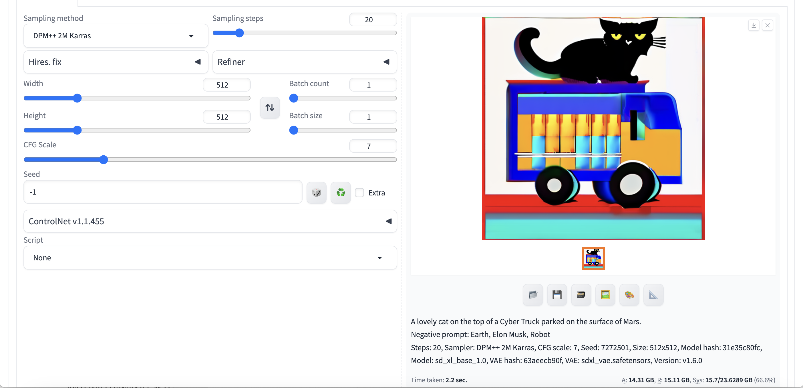 The first image was generated by the "sd_xl_base_1.0" checkpoint and "Automatic" SD_VAE, so that the model is given the absolute decisiveness with only the prompt given. All the parameters are set to the default mode, with a training step number of 20, a "DMP++ 2M Karras" Sampling Method, and also a size of 512*512. It resulted in something like this: It is highly cartoon-styled, in general. The position of the cat and the Cyber Truck are all correct. While the cat looks logistically right, the truck is a regular truck with loads of woods on it, not Tesla's Cyber Truck. This is one misunderstanding part. But the surface of the Mars looks totally fine.