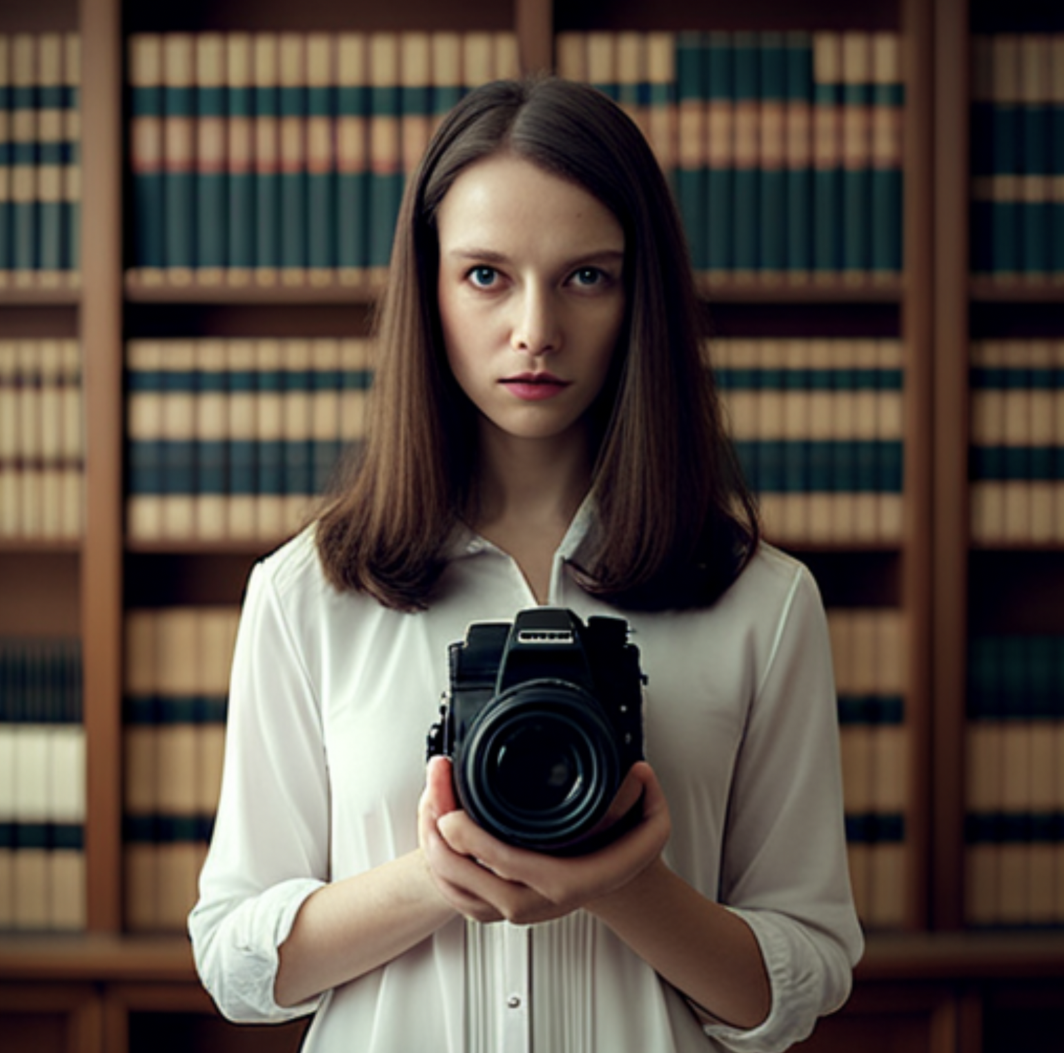a woman holding a camera in a library with bookshelves behind her and a camera in front of her, portrait photography, a character portrait, art photography, Anka Zhuravleva