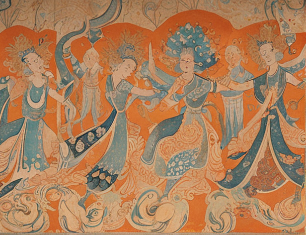 A reinterpretation of Flying Apsaras from Dunhuang, blending traditional Chinese mural art with modern abstract influences