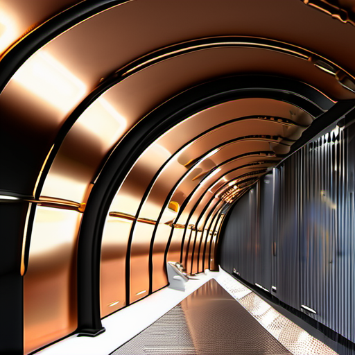 shot of Paris Metro station 'Arts et Métiers, featuring intricate copper riveted walls with porthole-like peepholes. The design has a steampunk, industrial feel, with a focus on the textured surface of the copper and the circular openings. The atmosphere is futuristic yet vintage, with subtle reflections of light on the metal, evoking a sense of innovation and subterranean exploration.