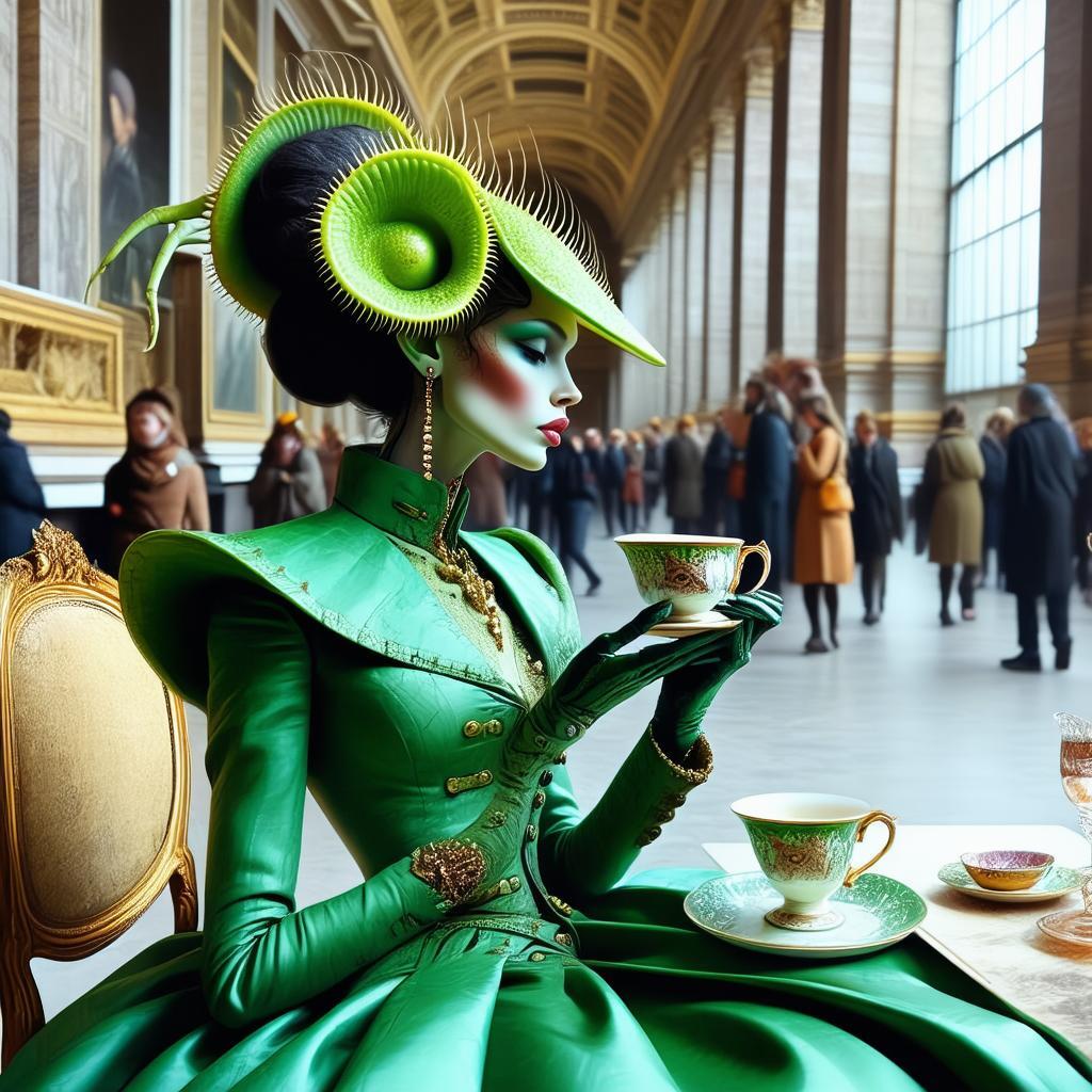 humanoid venus fly trap woman wearing luxurious clothes sipping tea in the louvre arkansas grassland bones and all final scene manga style Citroën grace jones audi quattro mars red car in distant background gritty 1980s style