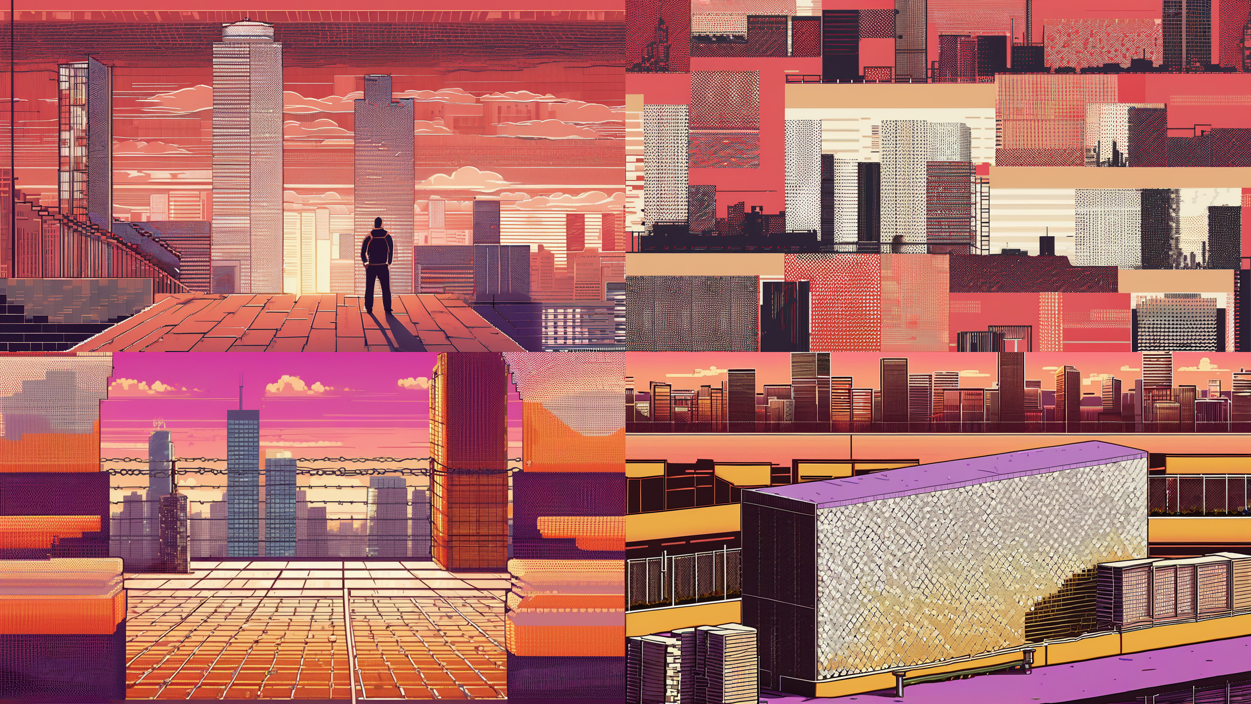 building, chain-link fence, city, cityscape, fence, halftone, pixel art, rooftop, skyscraper Steps: 40, Sampler: DPM++ 2M Karras, CFG scale: 8, Seed: 1237, Size: 1280x720, Model hash: 31e35c80fc, Model: sdxlbase1.0, VAE hash: 63aeecb90f, VAE: sdxlvae.safetensors, Denoising strength: 0.8, Version: v1.6.0