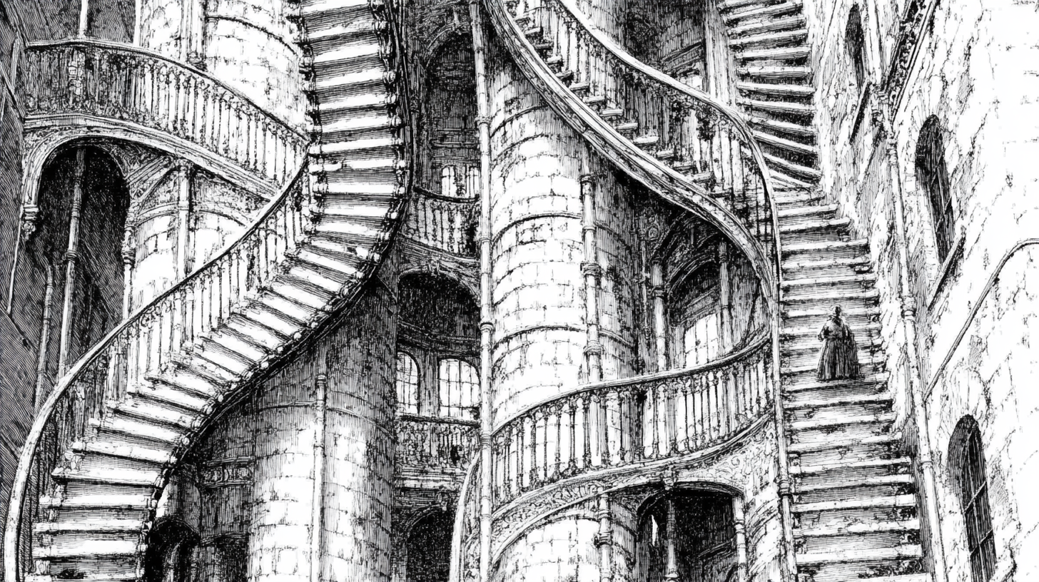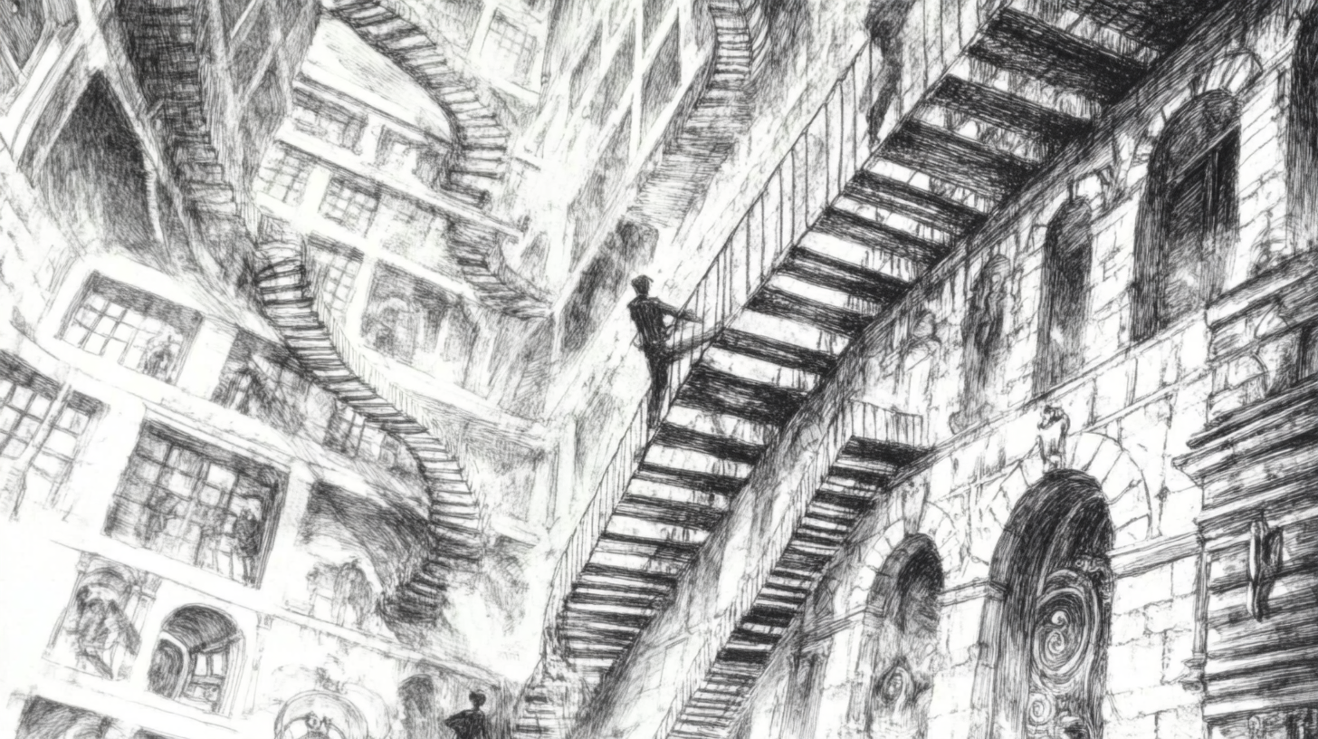 Midjourney: Giovanni Battista Piranesi. There were corridors that led nowhere, unreachably high windows, grandly dramatic doors that opened onto monklike cells or empty shafts, incredible upside-down staircases with upside-down treads and balustrades. Other staircases, clinging airily to the side of a monumental wall, petered out after two or three landings, in the high gloom of the cupolas, arriving nowhere. --ar 16:9 --style raw --v 6.1