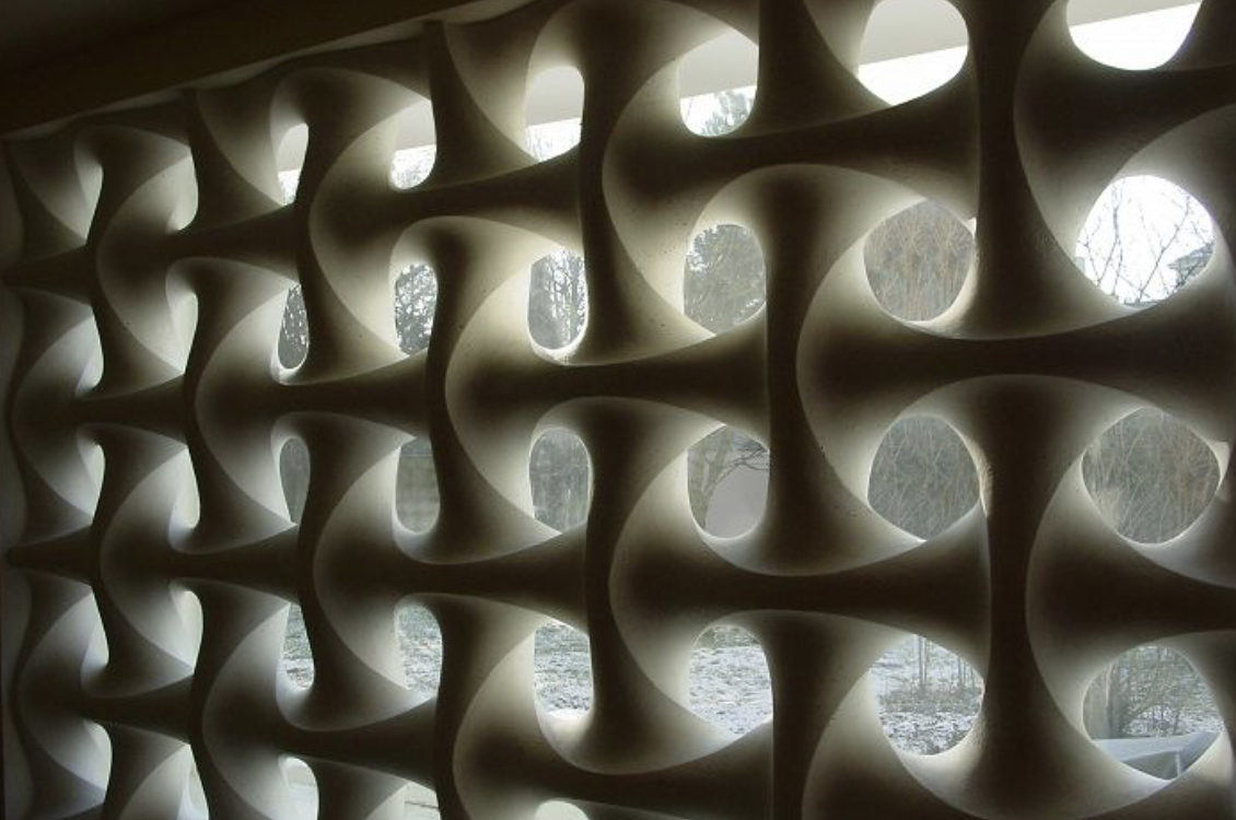One artist whose work embodies this intersection of art, architecture, and technology is Erwin Hauer. Erwin Hauer was an Austrian-born sculptor who created modular sculptures with infinite continuous surfaces. Some of his structures were used within architecture as room dividers or light-diffusing walls (Hauer, “Erwin Hauer – Spinneybeck”). His work consists of elements of infinity, continuity, and periodic repetition and encompasses material science, 3D design, computer-aided manufacturing, and advanced fabrication technologies (Hauer).