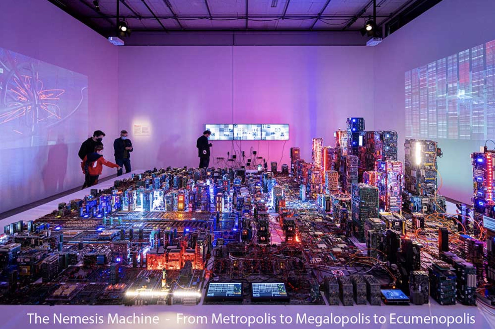 Integrating art and architecture in a different sense is Stanza, an artist based in London who created “The Nemesis Machine.” Fusing together electronic components, such as sensors, cameras, robotics, and computers, Stanza builds city-like structures that demonstrate the control technology has on humanity and how complicit and entangled civilization has become in a panopticon through modern technology (Stanza).
