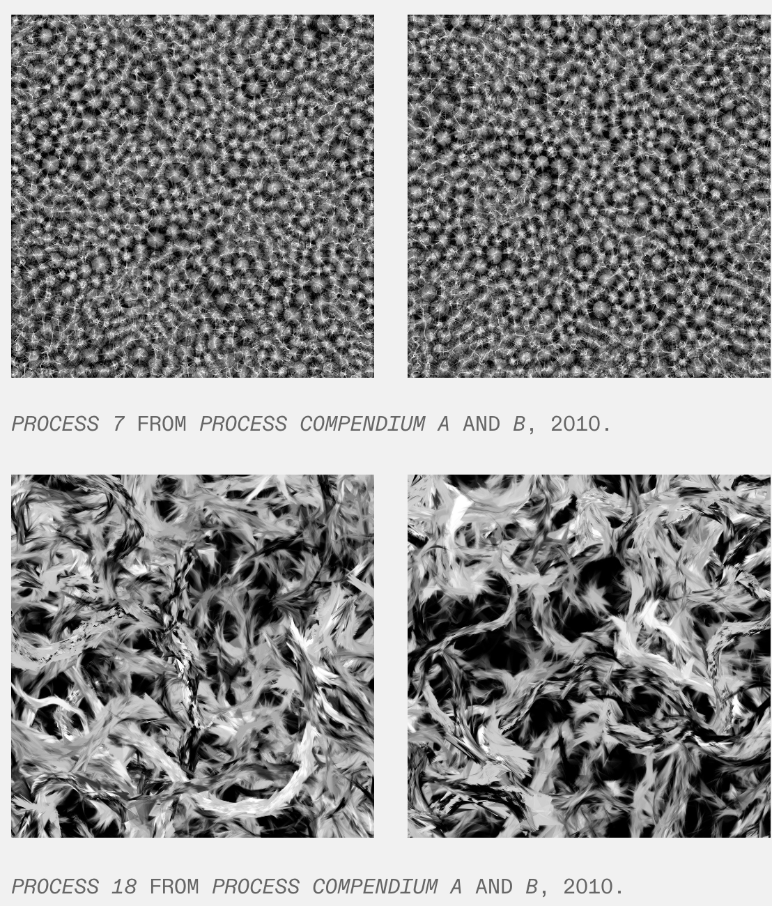 Casey Reas has been exploring self-organizing form as artworks for a long time. By applying simple rules, he created artwork that emerge from minimal behaviors and interactions of simple geometric shape.