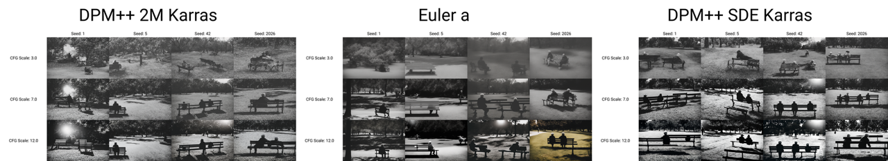 Experiments show “more obedient (high CFG)” isn't always better—it amplifies prompt instructions but also magnifies model flaws; the sampler itself functions like a stylistic filter, serving as a viable expressive tool in creation; Many aesthetic primitives aren't controlled by a single dimension but result from the combined effects of prompt, CFG, sampler, seed, and (if needed) structural constraints. This is crucial for those seeking rigorous, controllable design with SD.