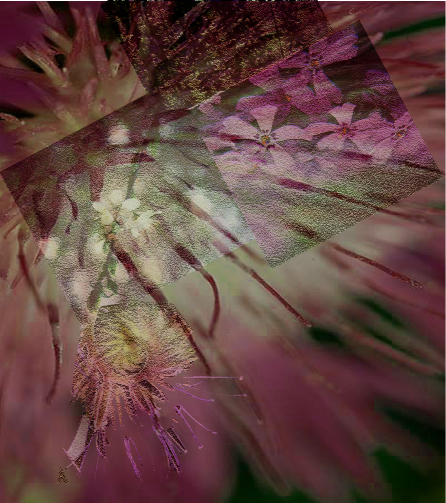 I utilized photomerge to merge photos of different plants and flowers, i changed the saturation, color balance, curves, hue, did a radial blur, and some other changes to create these images that play with light and nature.