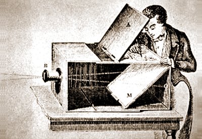 A camera obscura is one example of an optical instrument or device. These either process light waves in order to enhance an image, or they analyze light waves to determine more specific characteristics of the image. Currently in existence are many different optical devices: interferometer, photometer, polarimeter, reflectometer, refractometer, spectrometer, autocollimeter, vertometer, and others. Invented over a span of several centures, many different optical aides have come into existence. Along with the camera obscura, these include the camera lucida, the magic lantern, and the black mirror or claude glass. All rely on optics. Optical aids enhance accuracy. Hence, the camera obscura captured photos. Using similar design, the camera lucida was an optical device used by artists as a drawing aid. The device was patented in 1807 by William Hyde Wollaston, but speculation regarding whether he merely reinvented a device mentioned in Dioptrice by Johannes Kepler in 1611. Regardless, the device performs an optical superimposition of the subject being viewed, allowing the artist to simultaneously view the subject and the surface. The way the ‘technology’ works is similar to that of a double exposure in photography. The black mirror was also another device invented for drawing. It was a small, dark tinted and convex mirror that abstracted the subject reflected in it from its surroundings. This reduced and simplified the color and tonal range of the subject. These two devices took an understanding of the optics working in the camera obscura and used them in two newer devices that aided in drawing and not photography.