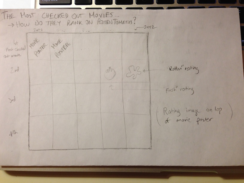 Since I had the movie posters to work with, I decided to make them the prominent feature in my project. I organized the movie posters in a grid; by year from left to right (2006 on left, 2012 on right) and checkout popularity from top to bottom (most popular on top). I used a similar approach used by the TA Yoon for displaying overlaid rating information with varying transparency when the user moves the mouse left and right. It's easy to spot movies that have ranked in the top 5 for repeated years. It's also interesting to see that while the vast majority of these movies were rated 'Certified Fresh' on RottenTomatoes (rated very highly), some received a 'Rotten' rating (rated very poorly). Very few were in between.