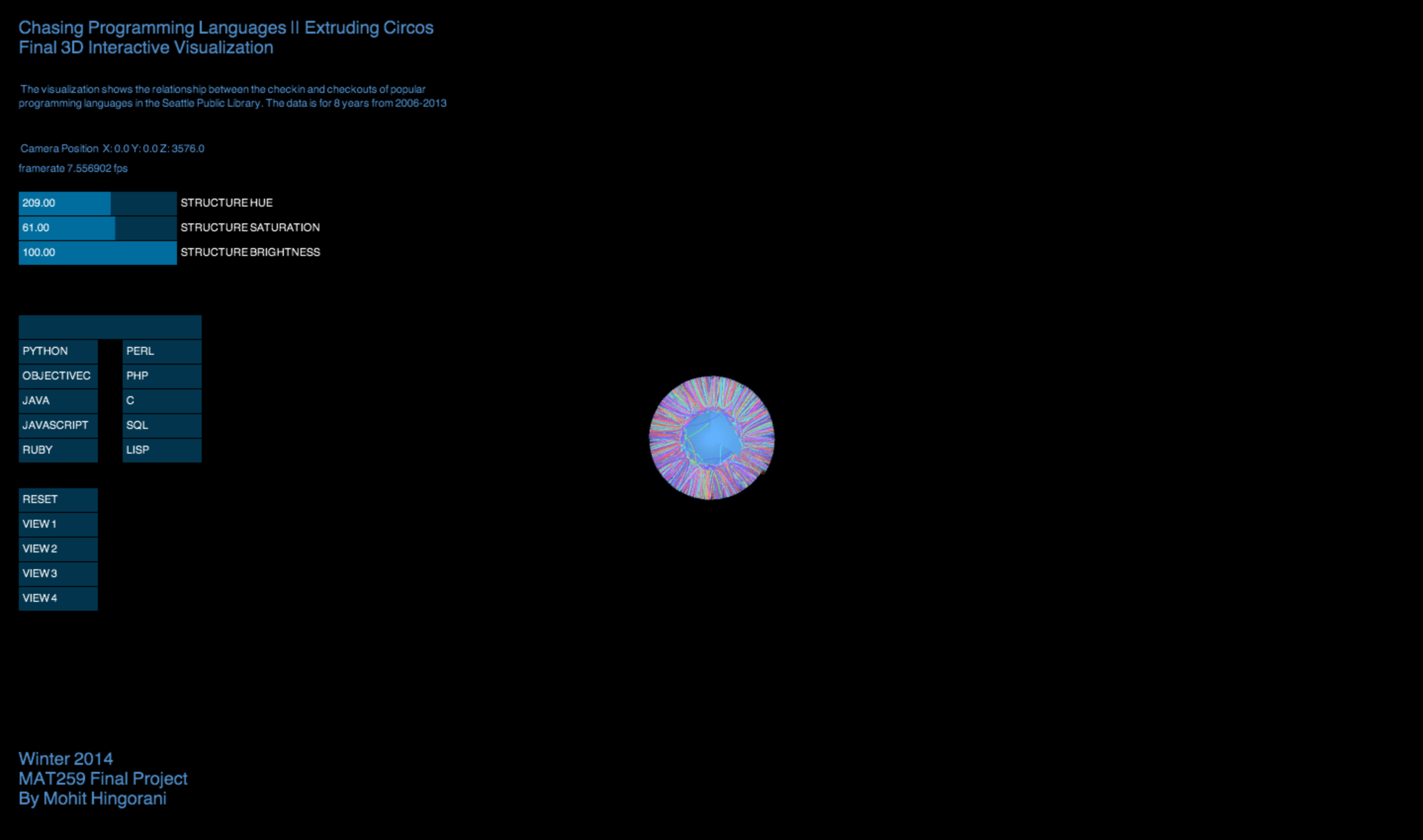 The design has been inspired by Circos (circos.ca) a data visualization tool used to visualize relationships. I intend to extrude the circle into a spiral thereby utilizing the third dimension to represent time. I have chosen bright blue for the spiral staircase with fine lines to demarcate the days. Each step represents a month. The background is black. I have color coded each language, and each book ( cin & cout ) is represented by an arc of that color. Obviously the checkout is lower in position than the check-in. The height of the arc is governed by how long the book has been checked out for.