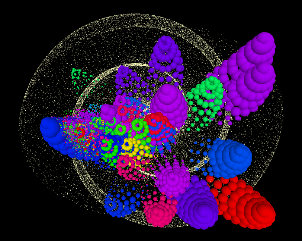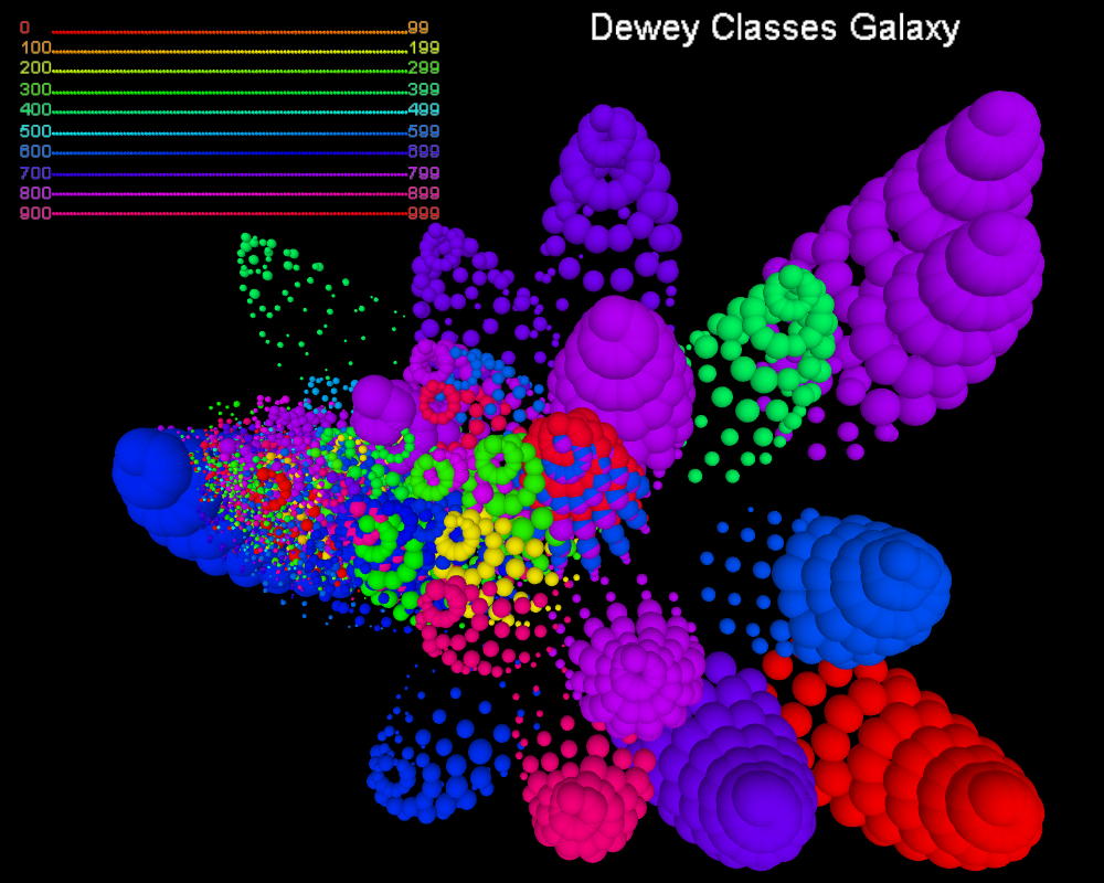 We are the astronomers of the information universe! I would like to integrate the beauty of the universe/galaxies pictures captured by space telescopes into consideration for the design of visualizing the clusters of dewey classes. The color hue schema will refer to the galaxy color and brightness analog to the sparking sky.