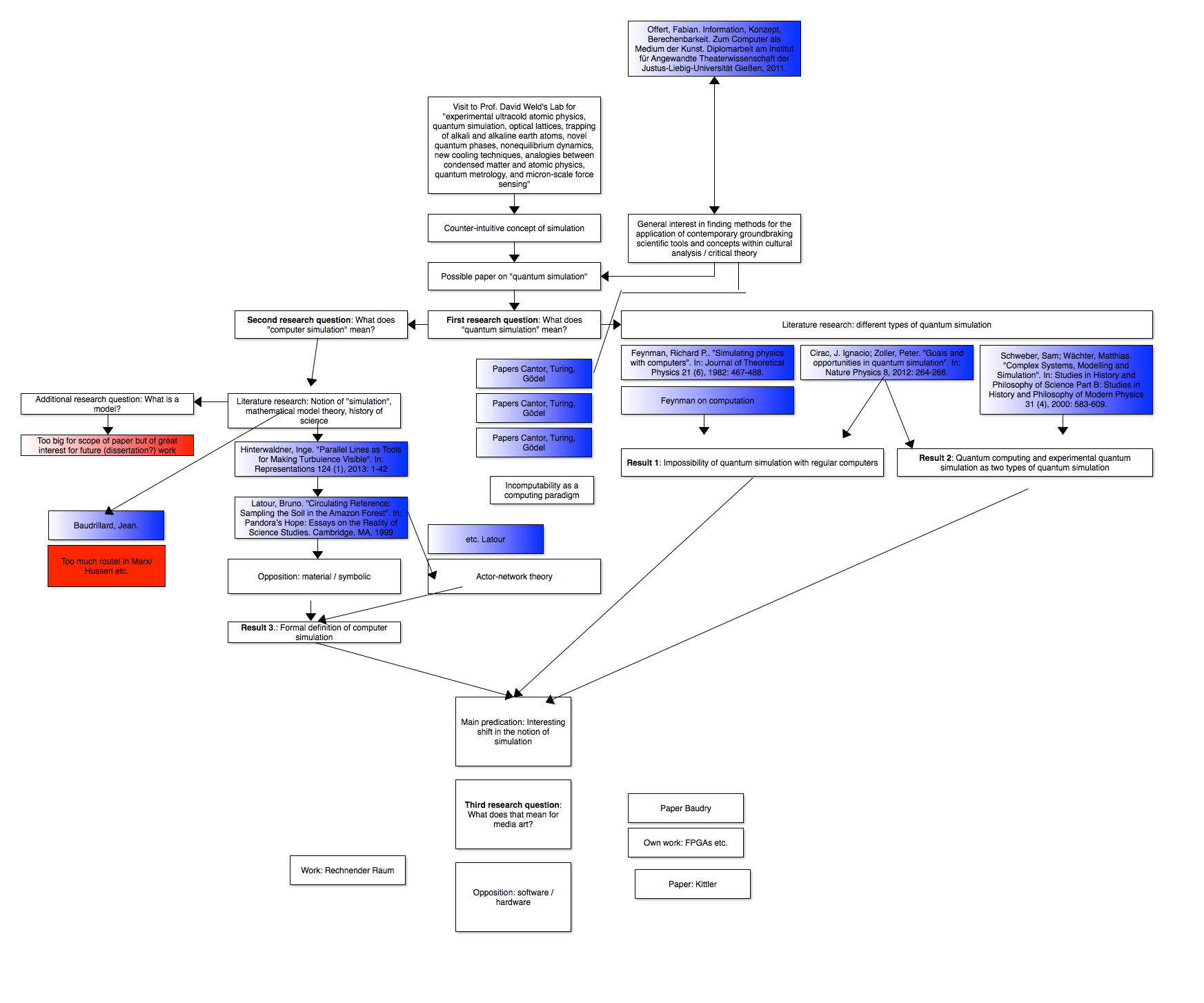Second, my own methodology in writing the paper is visualized in a "methodology graph". In this graph (that actually became both a helpful tool for and a reflection on my writing process) I show the flow of ideas over time, from a first interest in the subject of quantum simulation, triggered by the class visit to David Weld's lab, to my initial research questions and from there via various intermediate steps and literature reviews to the final argument. There is a simple color code to the graph, where sources (papers, books etc.) are represented as blue boxes, results as green boxes and "roadblocks" as red boxes. The graph is my answer to the first, second and fourth methodology questions: ""What are the rules, what are the conditions, what are the decision-making processes by which you do what you do?", "How did you proceed, everyone has certain ways of problem-solving?" and "What were the steps taken to achieve/realize the project?".