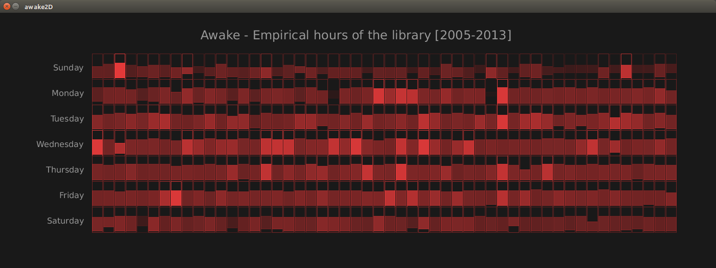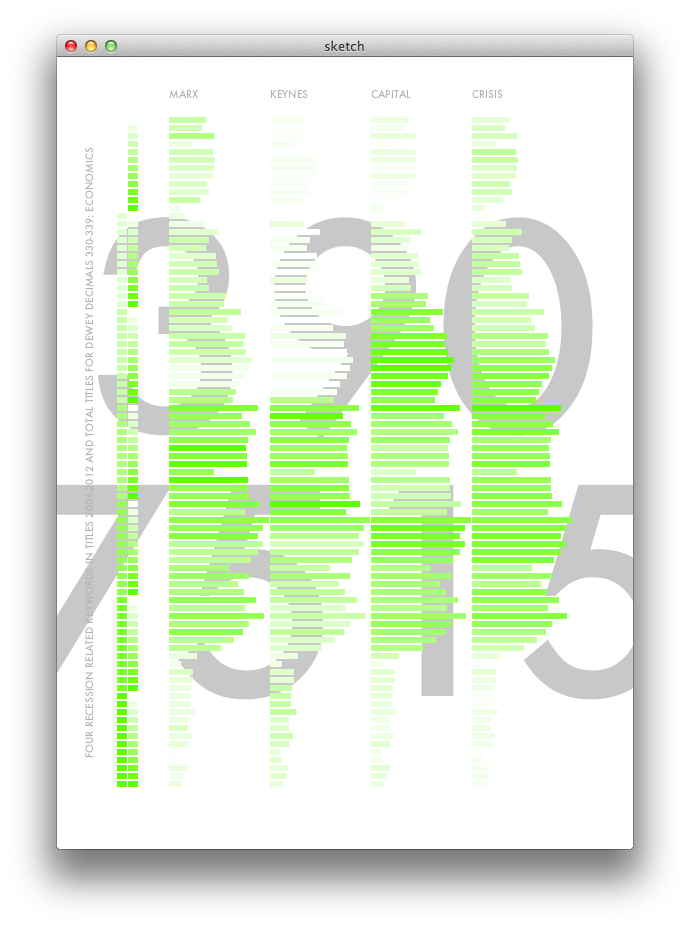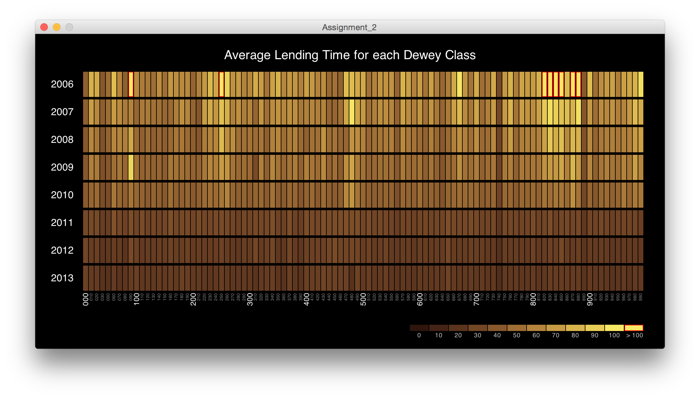 The visualization shows the average lending time for each Dewey class and each year from 2006 to 2013, using a heatmap metaphor. The color scales are designed using HCL Picker (http://tristen.ca/hcl-picker/), which provides a perceptually linear color scale (one exception: the blueish color scale comes from Mathematica). See http://vis4.net/blog/posts/avoid-equidi ... sv-colors/ for the reason why linear RGB/HSV is not ideal for data visualization. Each row of the matrix represents a year, each column is a Dewey category (100 sub-categories). The color of each cell represents the average lending time for the corresponding year and category. There’s a legend showing the color scale at the bottom right.