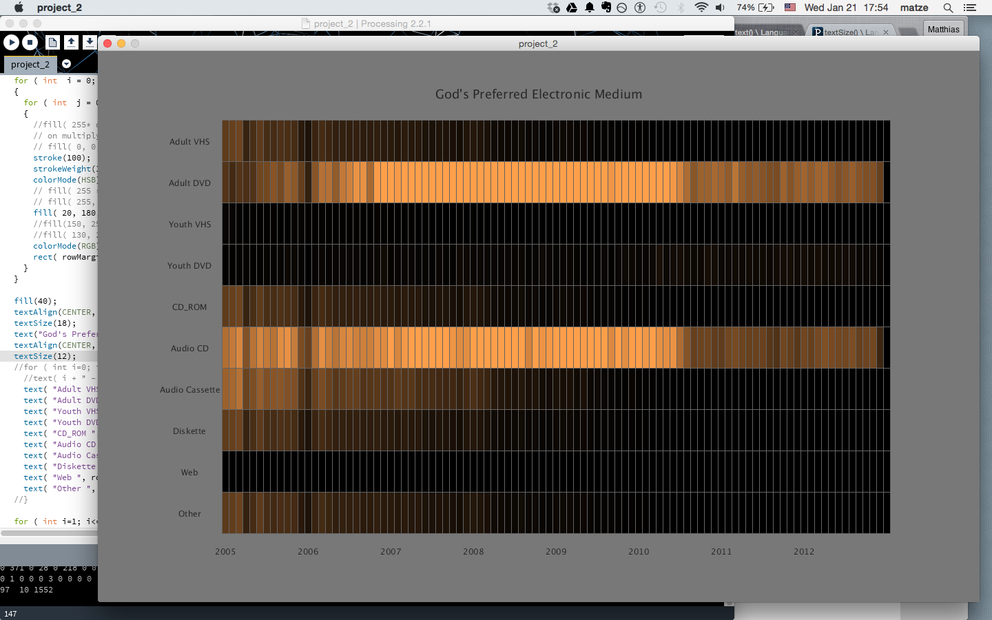 In Processing I arranged the data vertically by Dewey number, and within each Dewey number, 8 rows represent each successive year. Months of the year are represented horizontally. I implemented a slightly unorthodox method of coloring the data. There is a lot of variation within each Dewey class across time, but some Dewey classes dominate the data, for example 635 gets well into the thousands per month, whereas 630 stays in the hundreds. By modulating not only the brightness but also the transparency of each cell in the matrix, more variation can be revealed in the low range while maintaining variation in the high ranges. I made the alpha channel have a minimum value of 20 (out of 255) for legibility and aesthetic reasons. Hue varies based on Dewey number.