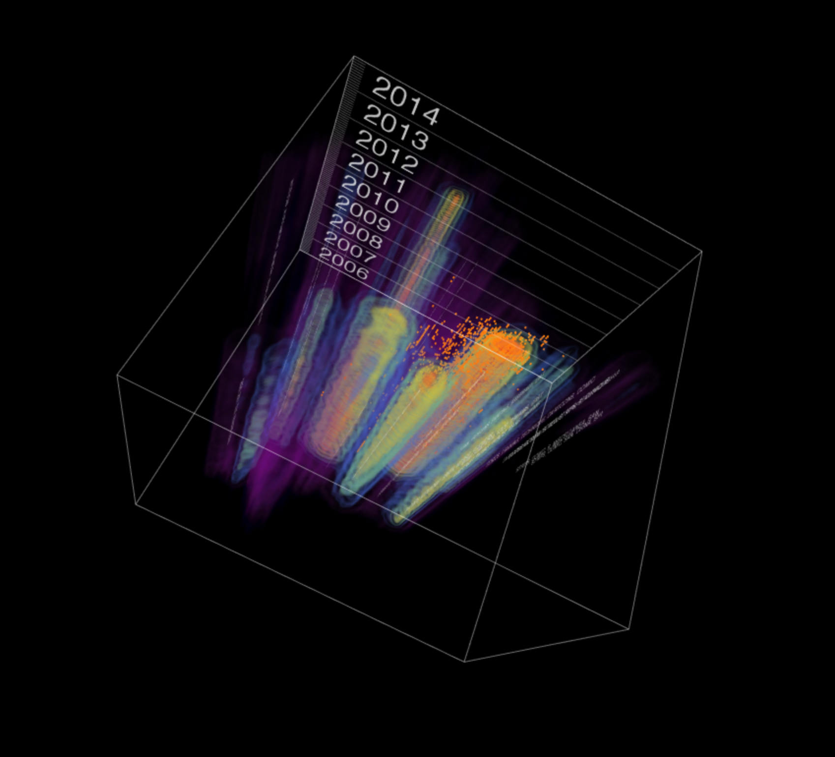 This project is based on the previous assignment. In the volume, the X-Y plane represents all books in the library. Z represents time, from 2006 to 2014 monthly. Color at x,y,z means the "checkout density" at book location x,y and time z. The mapping from books to x,y is done by a 2-layer RBM model.