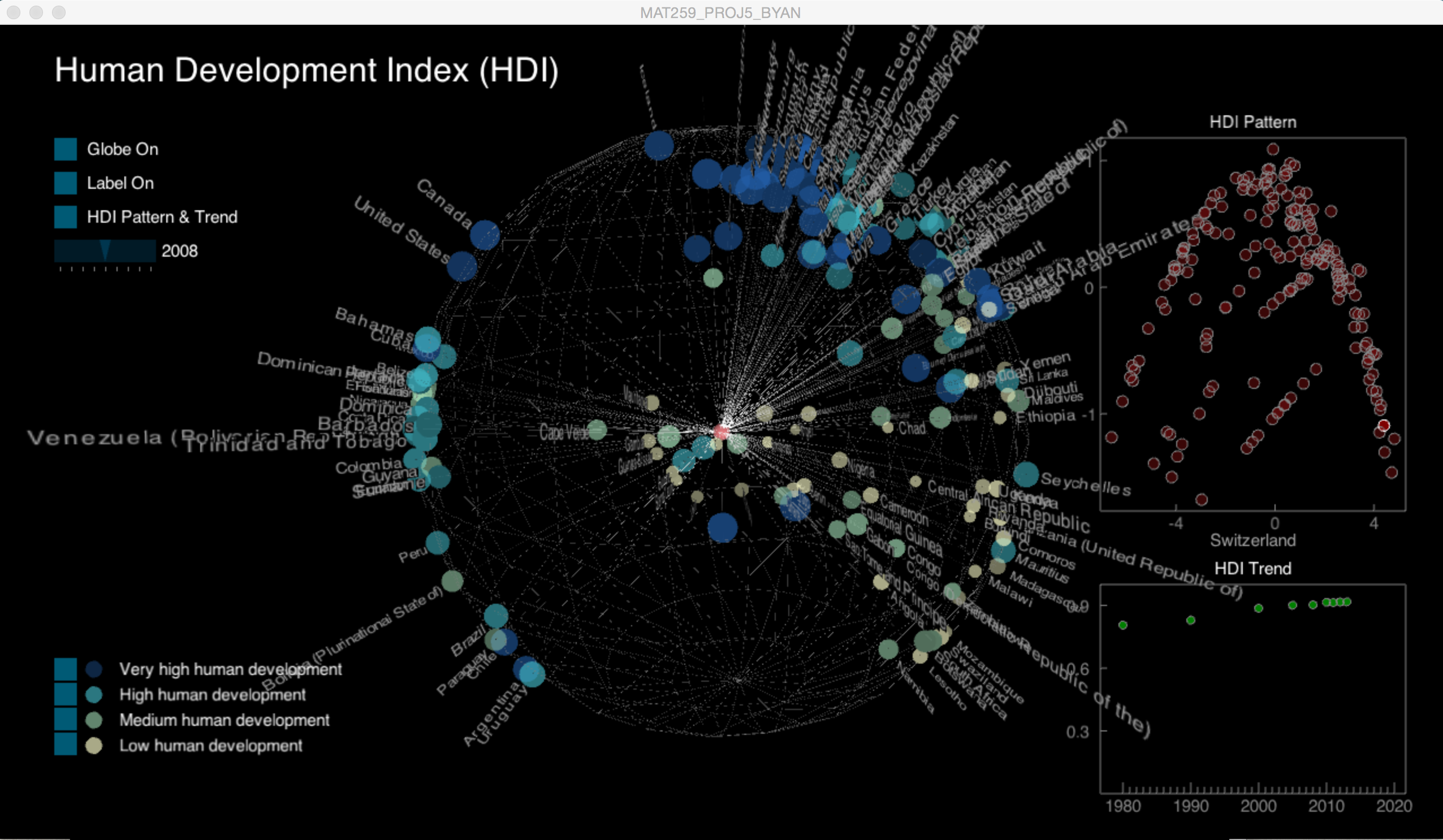 Originally, I wanted to map these countries and regions onto a world map using the Unfolding map library, but after exploring the library for a while, I found the library not really customizable, so I decided to use the 3d visualization I did last time. I found the coordinates of the capital city of every country and geo locate them on the globe. I used points to represent the hdi value, the larger the point size, the bigger the hdi value. The points are also categorized into 4 groups based on their hdi values.