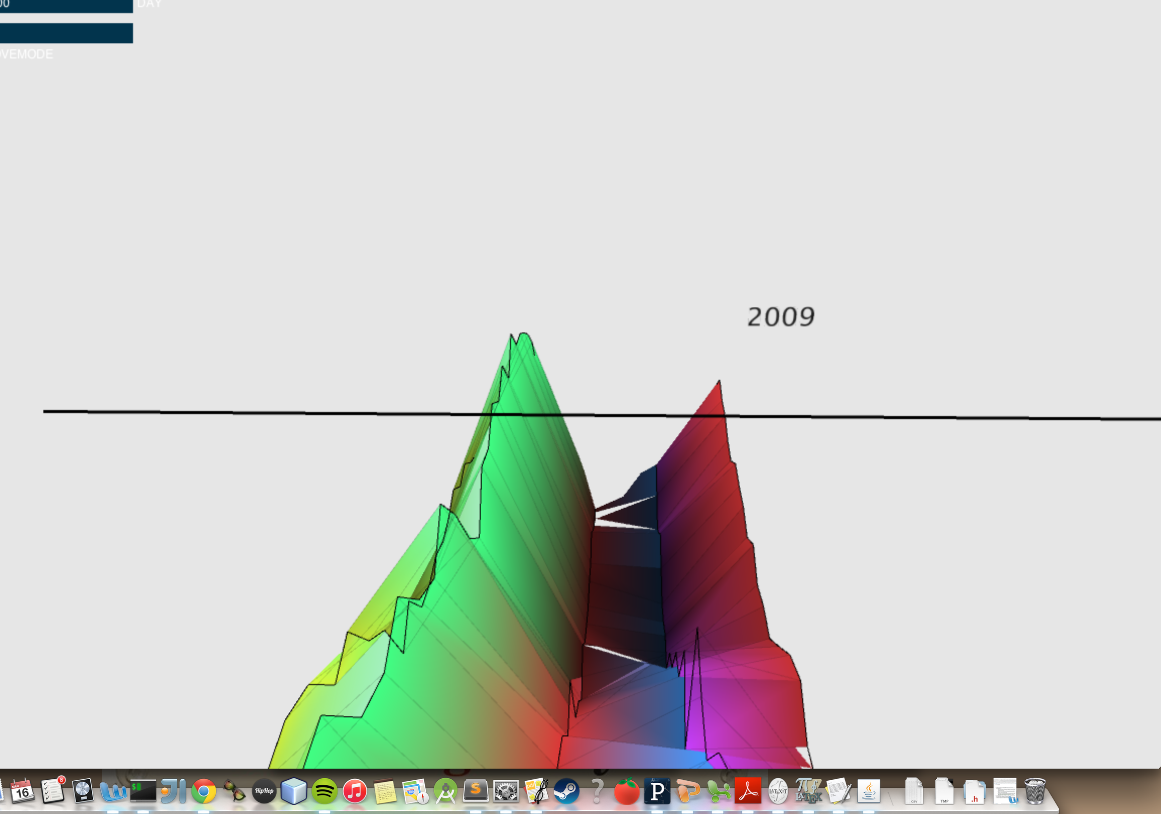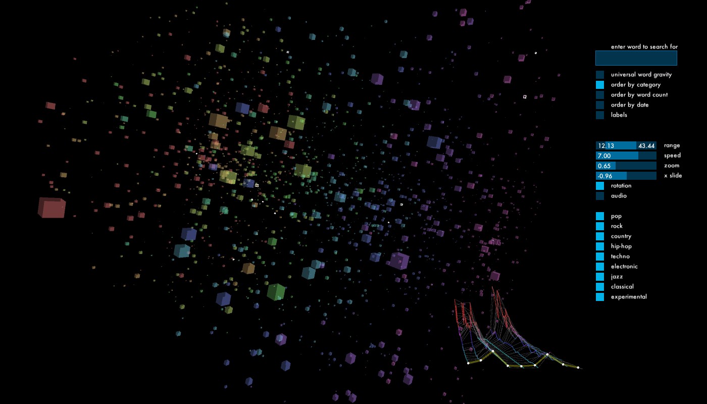 For the main part of the window, I displayed every article, which returned from the database as a cube. Depending on which genre, each cube has one of 9 colors, equally mapped over HSV color range. The size of the cubes is determined by the word count of its content. The cubes, which start out in random positions, can be organized according to category, publication date and word count. The outline of each cube lights up, when it matches the category and year of the histogram scrubber. This way, it is possible to get different perspectives on how the writing about each genre changes over time.
