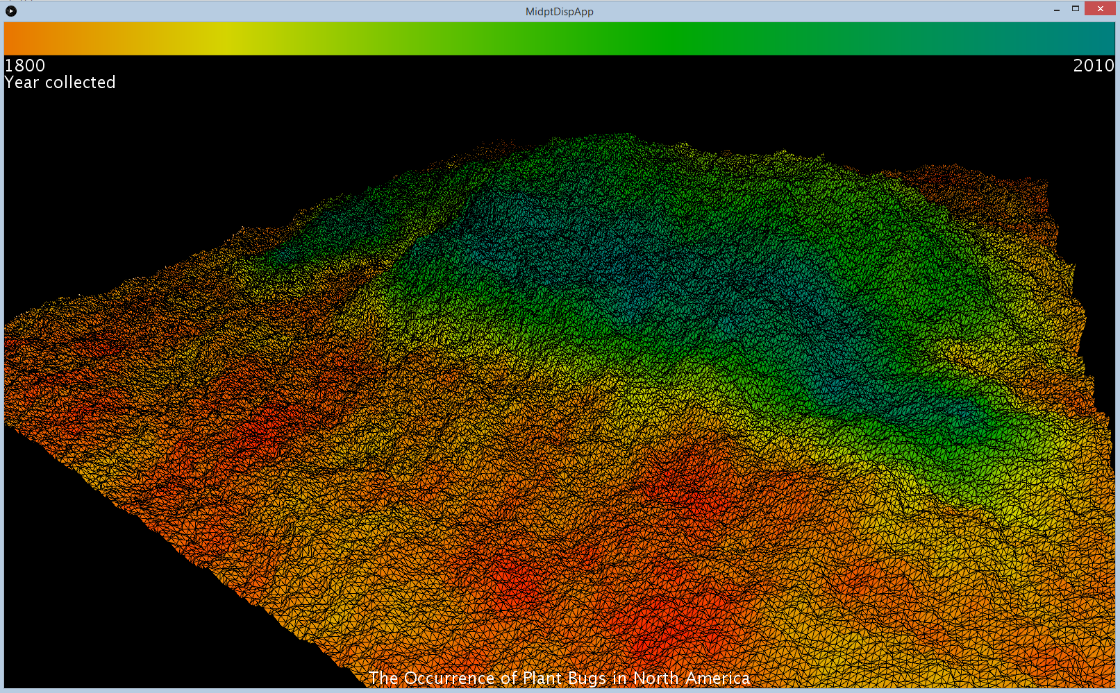 I first wrote a program to draw triangle strips. Then I implemented the midpoint displacement algorithm to generate cloud-like fractal. Finally I integrated both programs and entered the information on where the bugs were collect into my program, creating the 3D terrain that visualize insect occurrence. I also colored the terrain to show when the plant bugs were collected. The time frame ranges from 1800 to 2010.