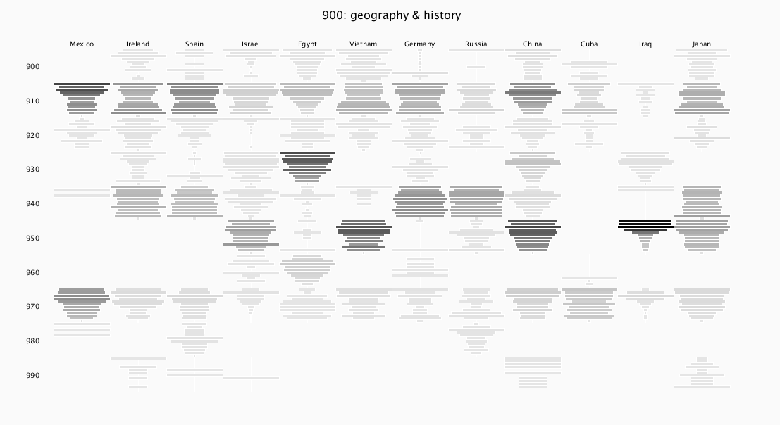 By default, all the bar intensities correspond directly to number of overall checkouts, so intensities can be compared between countries and years in the same panel. The bar widths are renormalized within each individual dewey category "block" -- the most popular year within each block has a bar that spans the whole block, and the remaining bars in that block are scaled proportionally to that longest bar. This creates a distinctive shape within each block that represents the waxing and/or waning of interest in that country/category over the years. The darkest bars in the entire layout still correspond to the most popular overall categories. For example, in the screenshot above, "Iraq" has bars that span the whole column in both 930 and 950, representing the most popular year in each block. But the color shows that there were many more checkouts in 950 overall compared to 930.