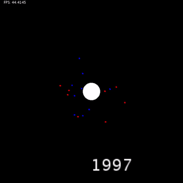 In addition to the color, each planet (represented as a point on the screen) has two more attributes: Normal velocity and tangential velocity. Both of them are bonded with a value that describes the degree of activity of Brain Tyler in each year.