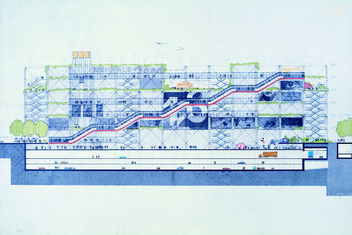 Background information of BpiTHE BUILDING’S MOST FAMOUS STRUCTURAL FEATURE IS ITS “INSIDE-OUT” CONSTRUCTION, WHICH EMPHASIZ- ES THE IDEA OF THE CULTURAL CENTER AS A MACHINE AND PLACES THE MECHANICAL SYSTEMS ON THE EXTE- RIOR, TO KEEP THE INSIDE UNENCUMBERED AND OPEN