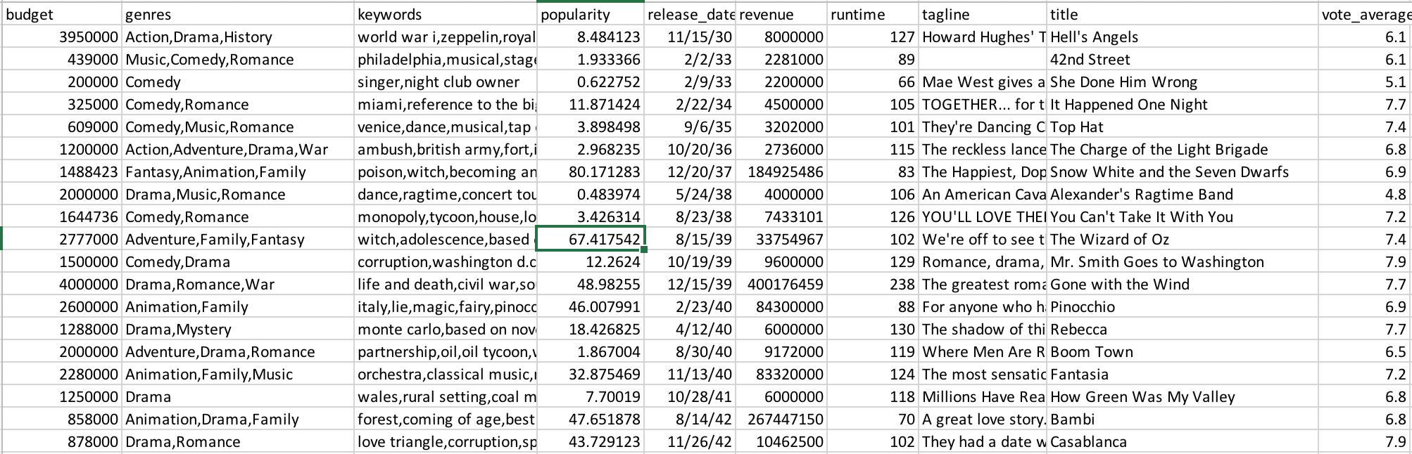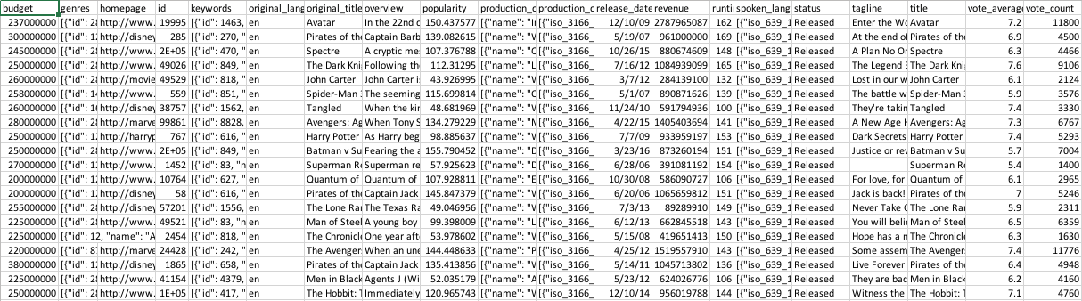 I use the dataset from TMDB(website same as IMDB but it provides open API to access to its database), which contains basic information of 4804 movies from 1930s to 2010s. The raw dataset that I pull down from TMDB API looks like this: After running a script to preprocess the raw data and delete unnecessary features, I have the organized dataset I'd like to use for my final project. It's pretty clear and straightforward. Every movie contains following features: budget, genres, keywords, popularity, release_date, revenue, runtime, tagline, title and ranking(vote_average). Sketch
