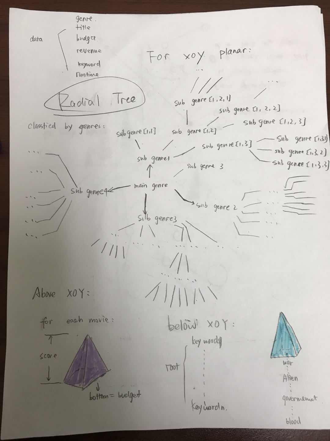 Sketch I: When I visualized the radial tree, for a 19-branch and 6-layer tree, the space is too small for the next 3D visualization. So I decided to generate separate trees for each genre. From above, it's easy to see the distribution for main genre and subgenres.