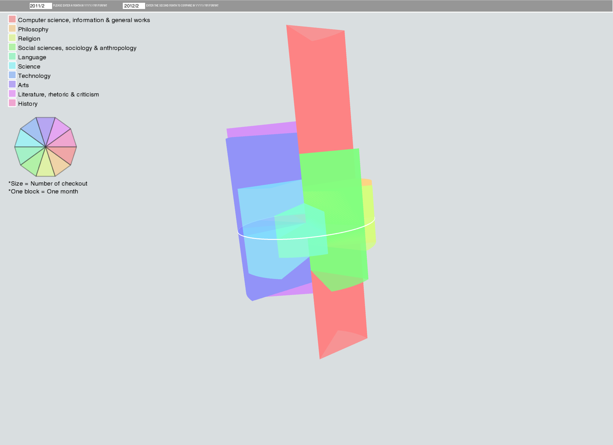 I used the same data from the last assignment which contained the number of checkout time for ten categories books in ten years. The aim for the final project is to make visualization more clear that people can get information from the plot at first peek. The basic shape was not changed but the arrangement became different. Since there were exactly ten years and ten categories, I divided a circle into ten parts and made ten years data along the direction of split lines. Compared to the last assignment, this project showed clearer comparison between each month in same year. However, the trade-off was that user could not make comparison between different years. As a result, I add a feature for user to check the data in specific month. I designed two text field. If user only enter one month, sectoral cylinders would show above the center plane. If user typed in another month, the other sectoral cylinders would show in opposite direction. *The height and size do not represent the true number of original data due to the high ratio between the maximum and the minimum.