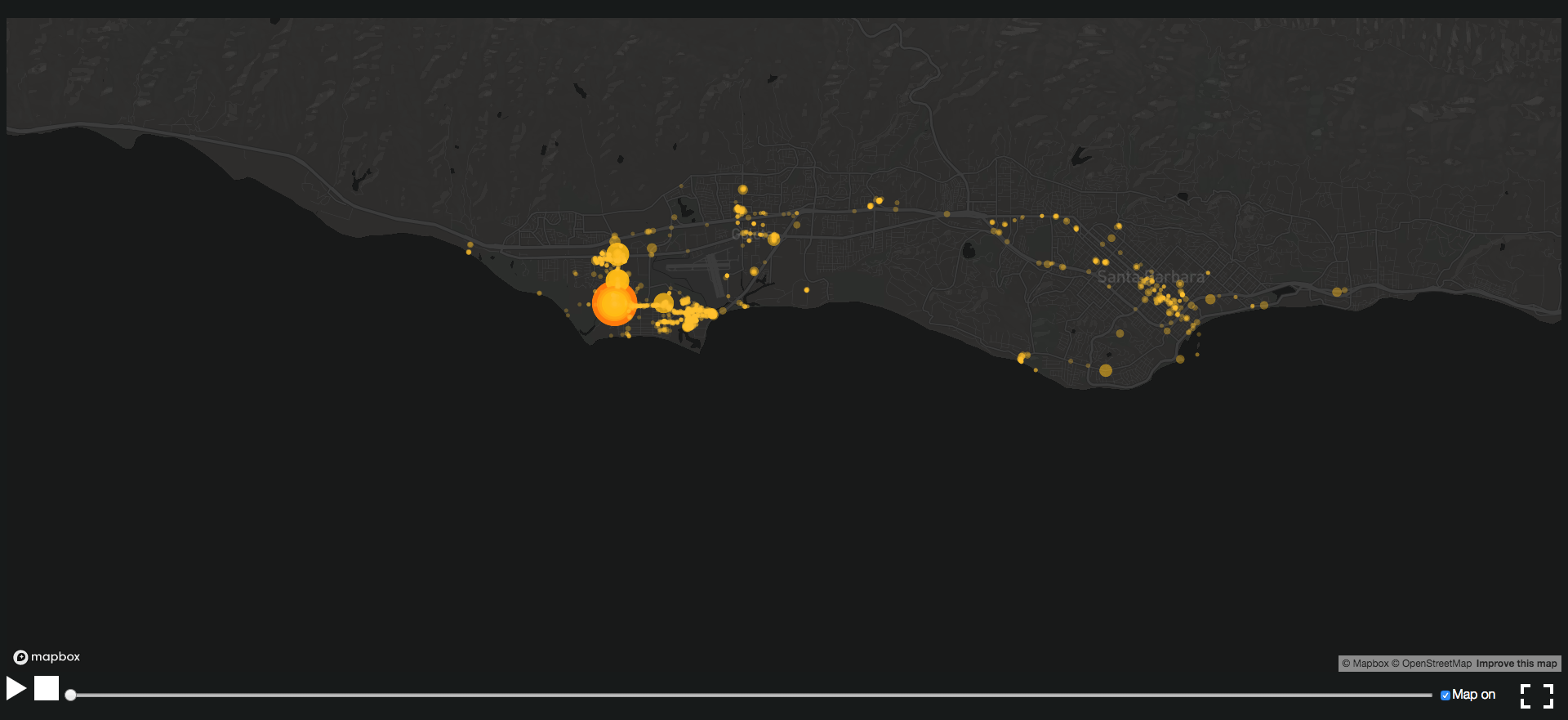 BeHAVE has a GUI for controlling playback and exploring data on a map. An audience can play or pause the data exploration mode and control the position of a timeline scrollbar to jump into a certain date. Also, it is possible to toggle full-screen mode and decide whether to see the background map information or not. During the data exploration, an audience can zoom in and out or move the center location of a map with a mouse to look over the overall shape or detail of drawn lines.