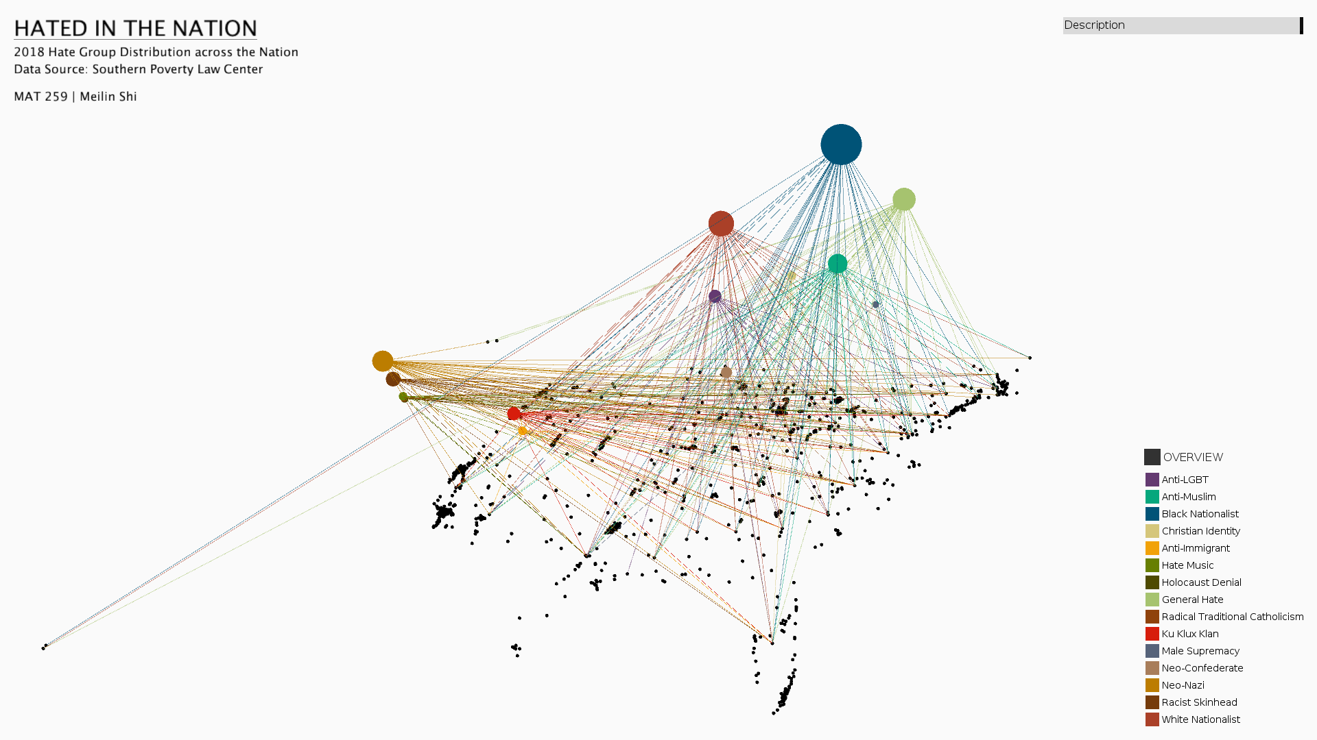 The overview of all hate groups. Each line represents a single hate group. The color of the line indicates ideology, connecting the hate group's location at the bottom with the ideology dot on top. I also include the description for each ideology when making single selection. Interesting to see some of the groups show a spatial context, for example the Neo-Confederate groups only occur at the southwest corner of the country.